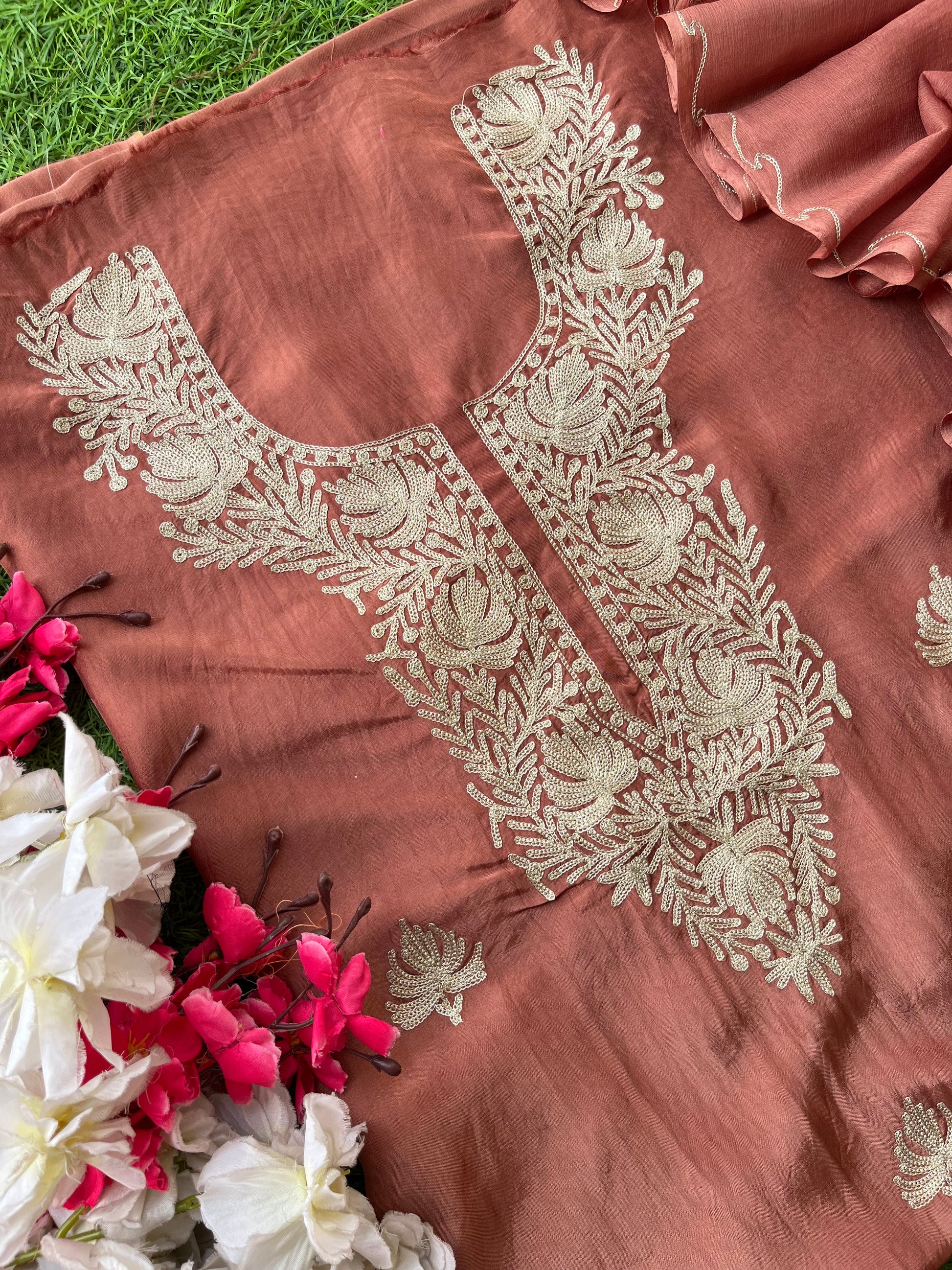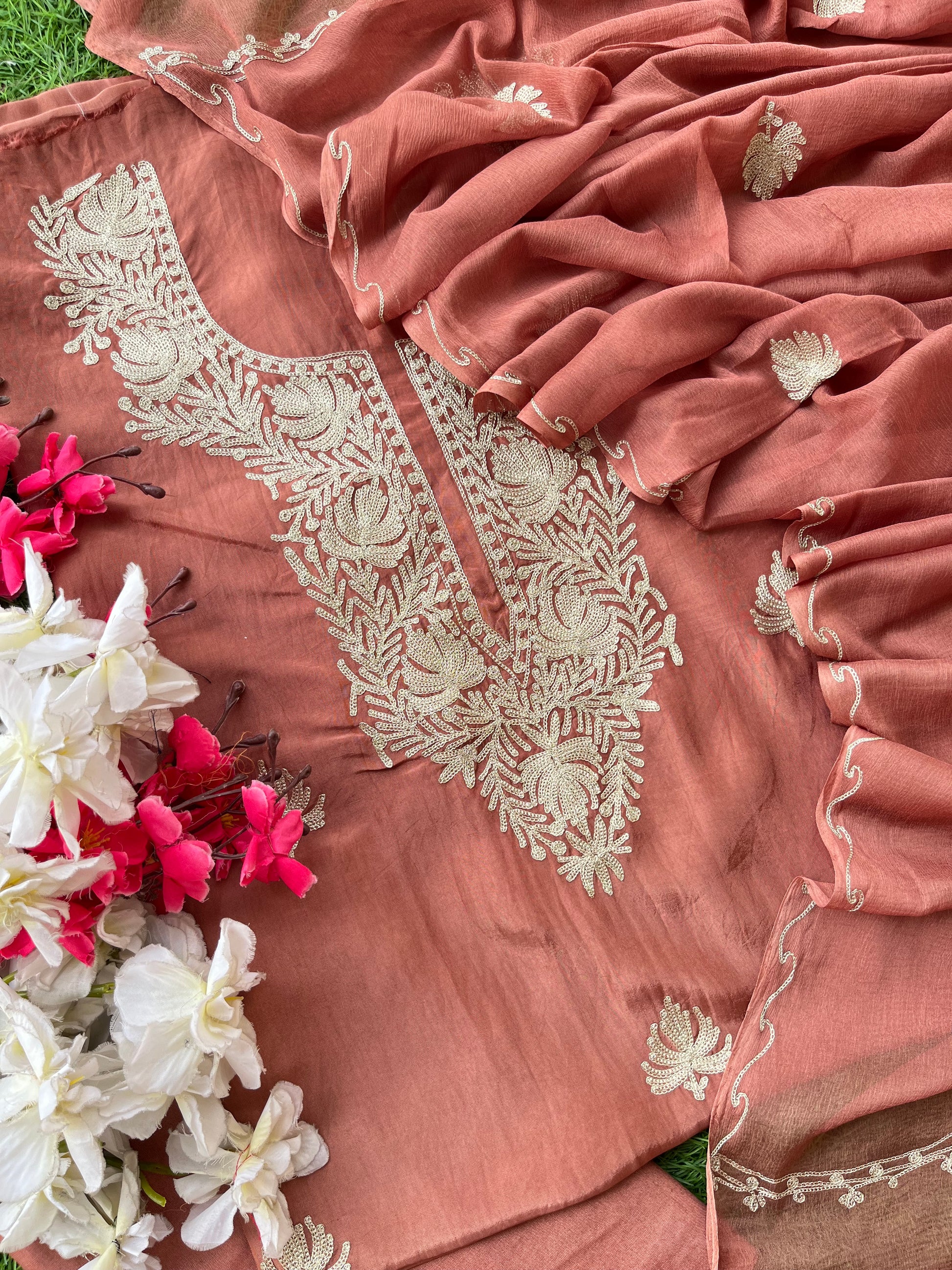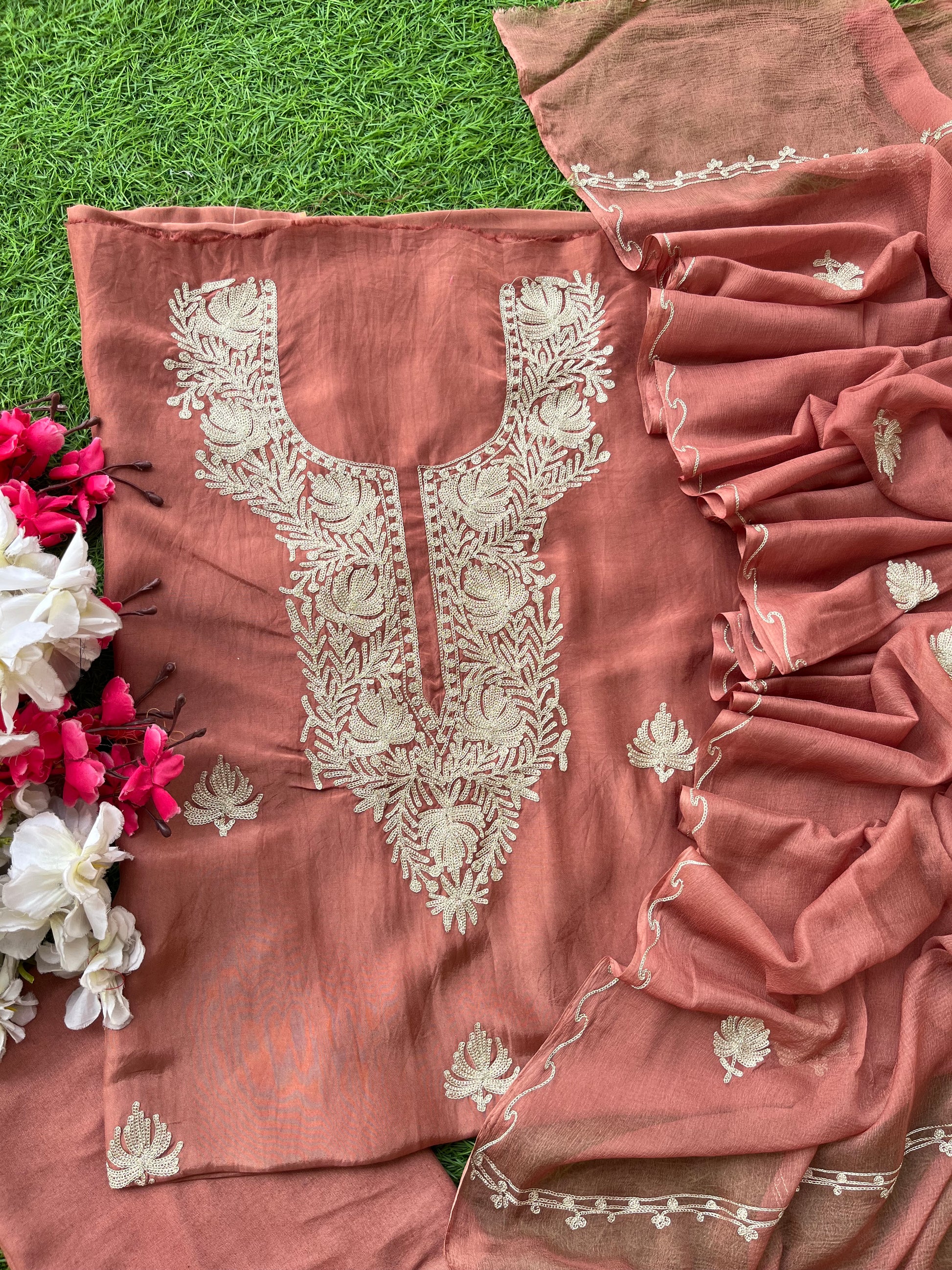 Dull Peach Silk Tilla Kashmiri Suit