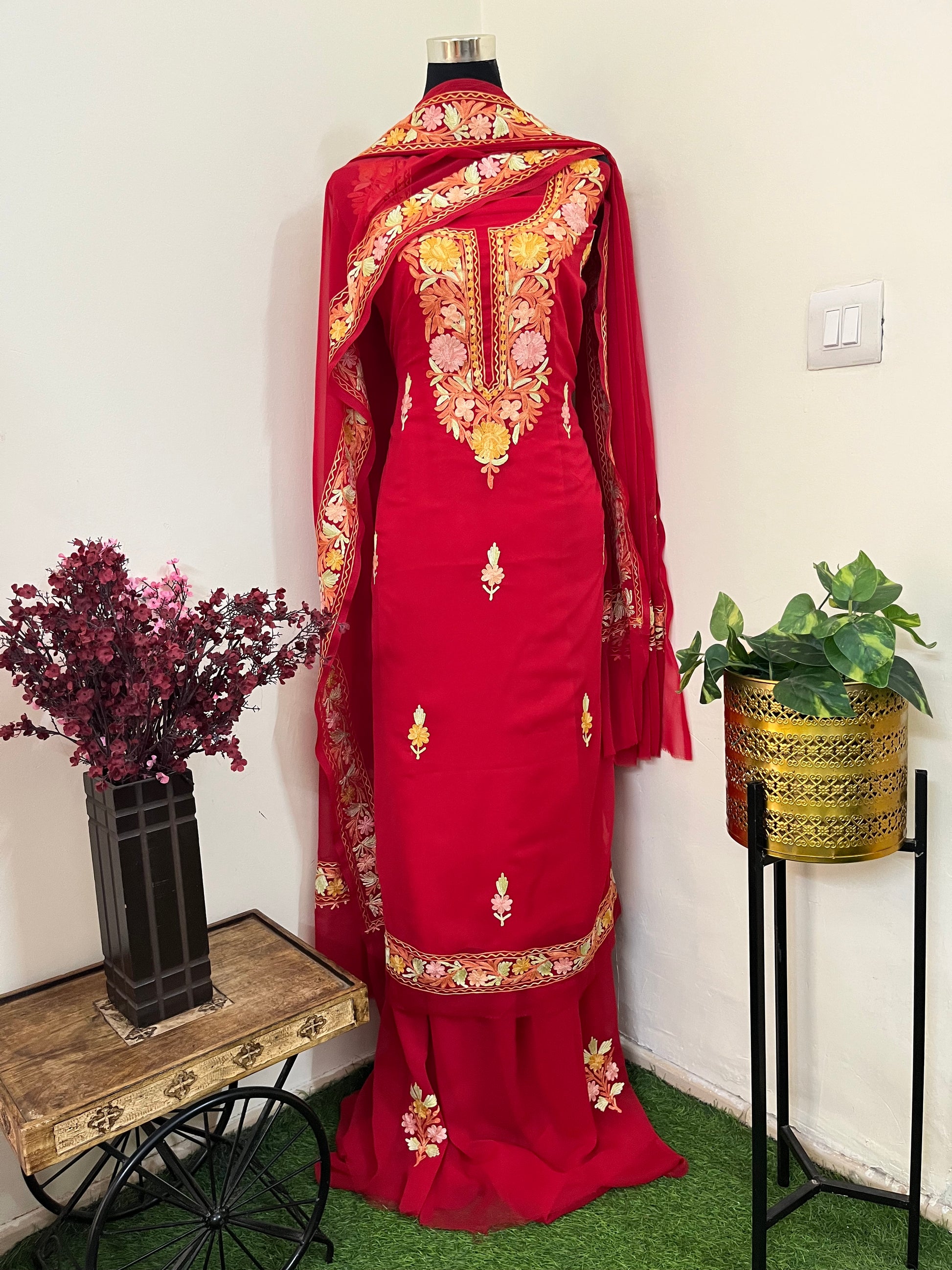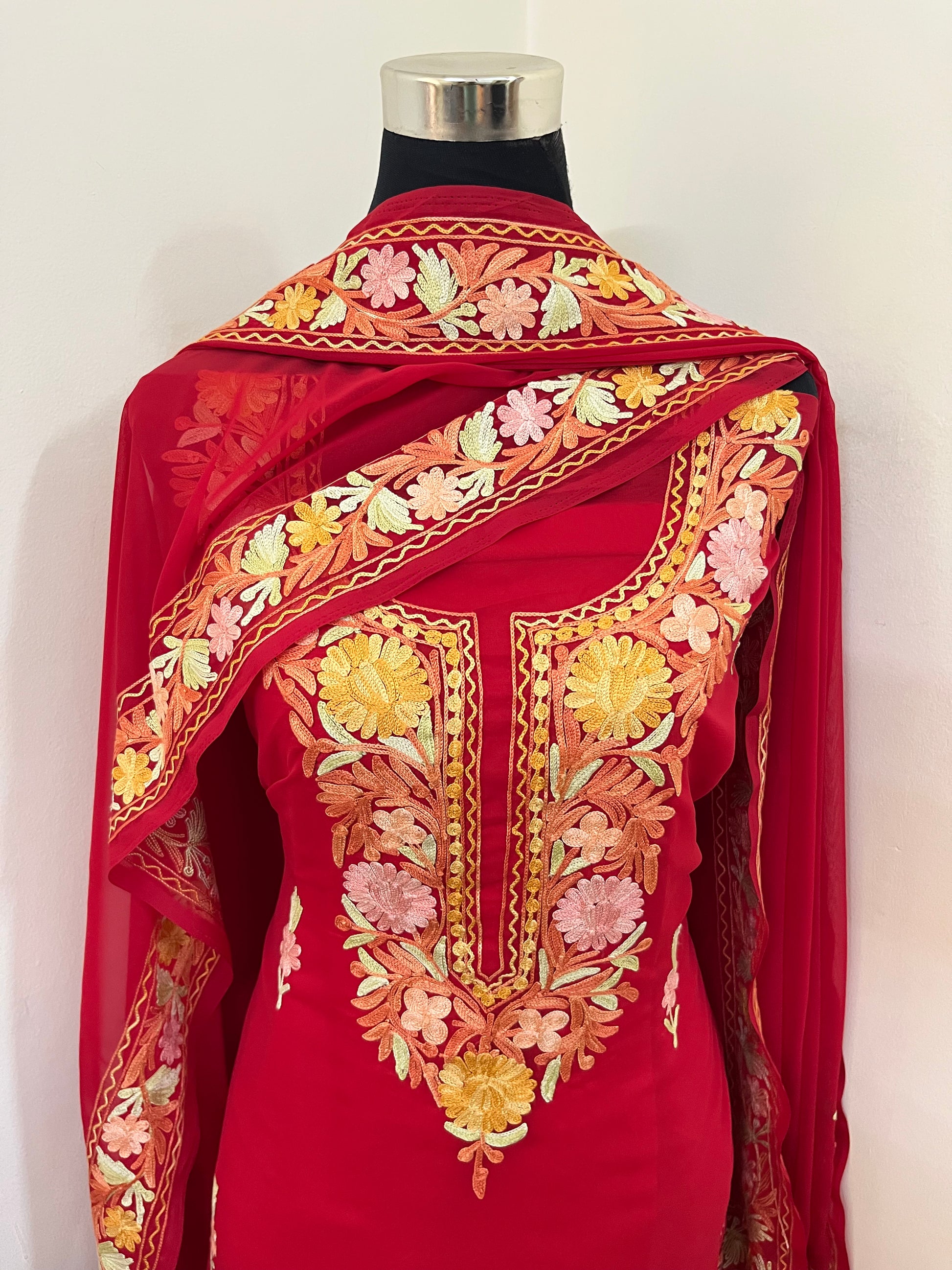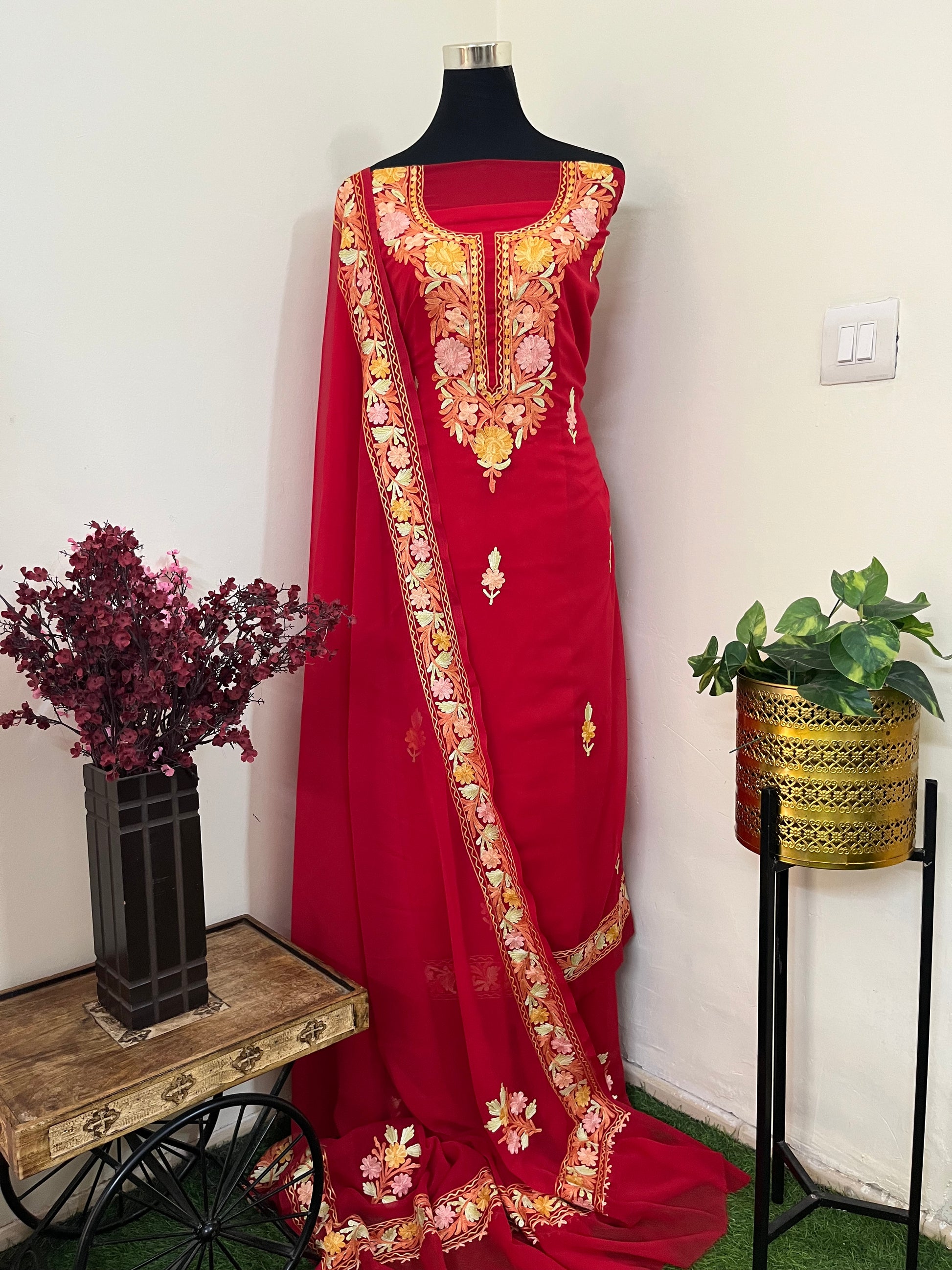 Red Georgette 3 Pc Aari Embroidered Suit Set