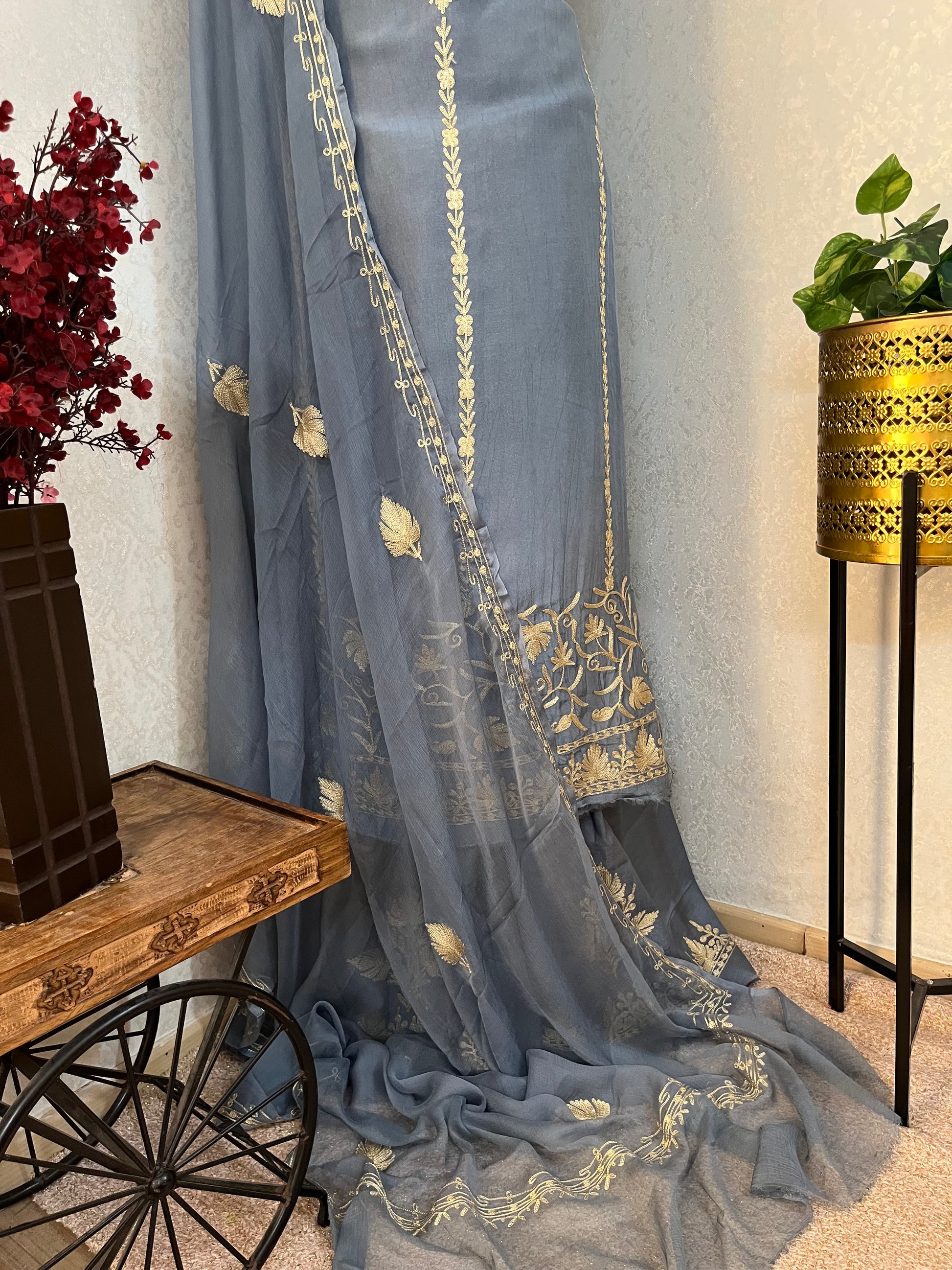 Indulge in the epitome of elegance with this luxury Kashmiri Tilla embroidered suit. Meticulously handcrafted with intricate details , this opulent ensemble exudes regality and showcases the rich cultural heritage of Kashmir.