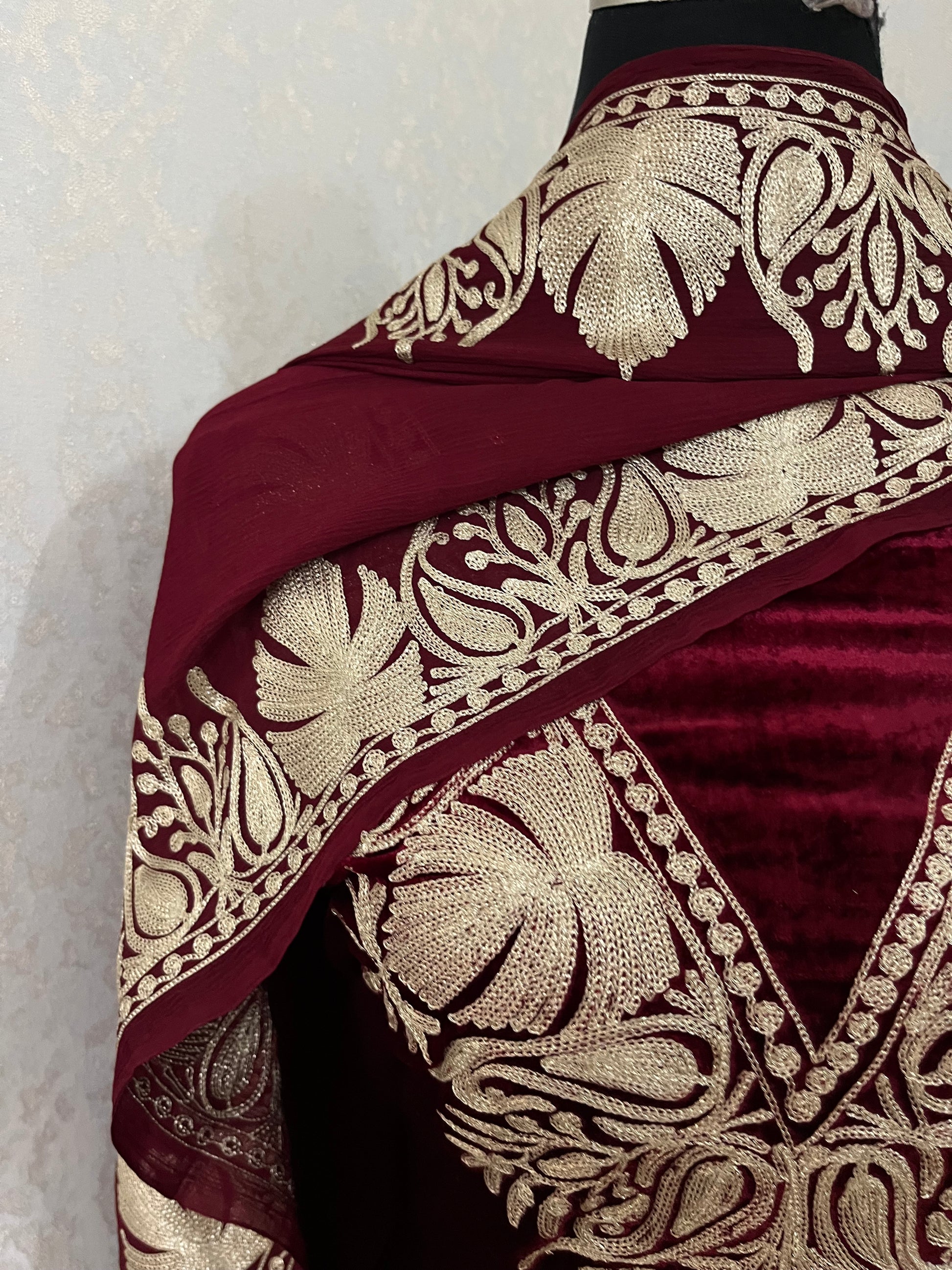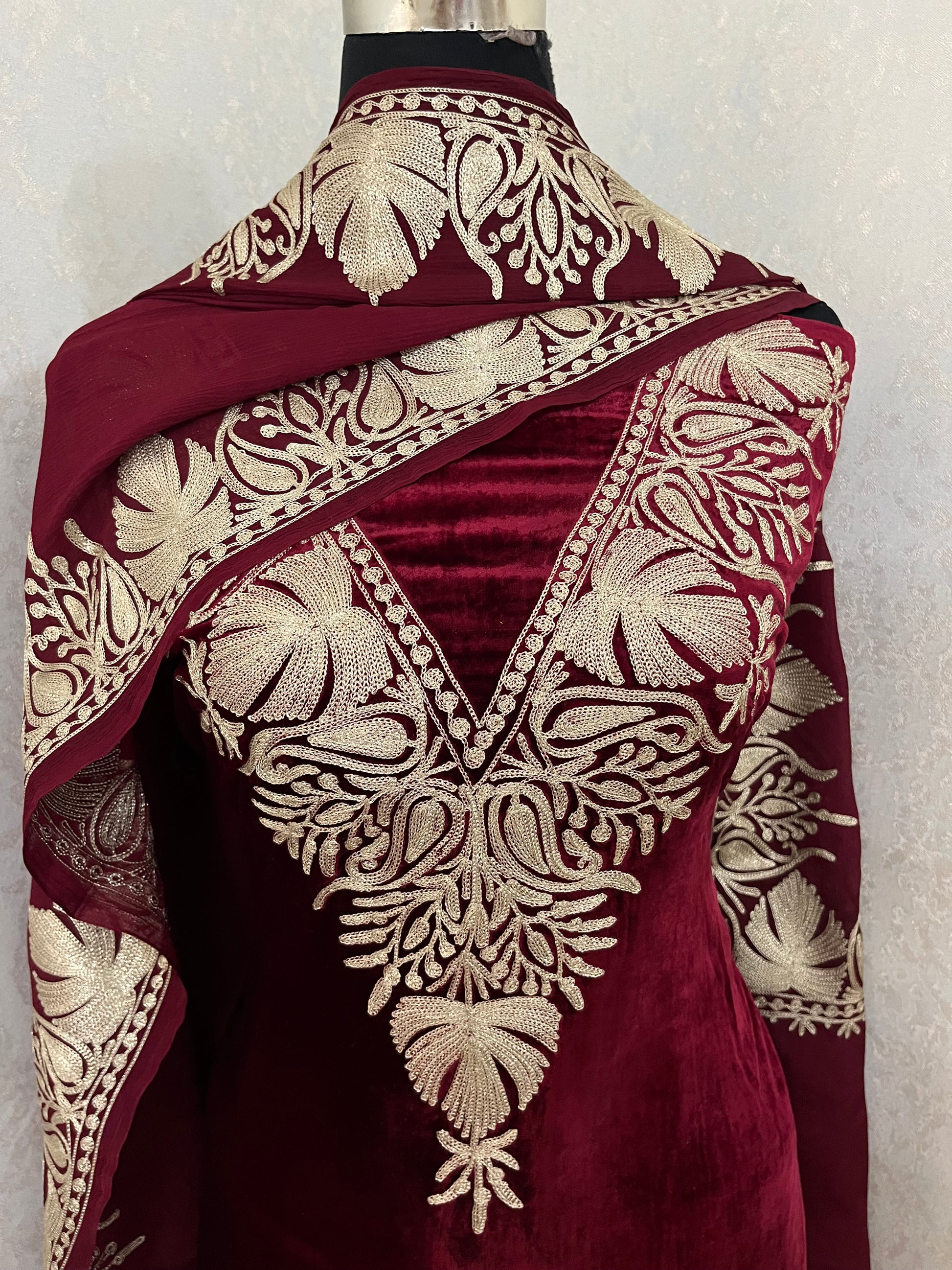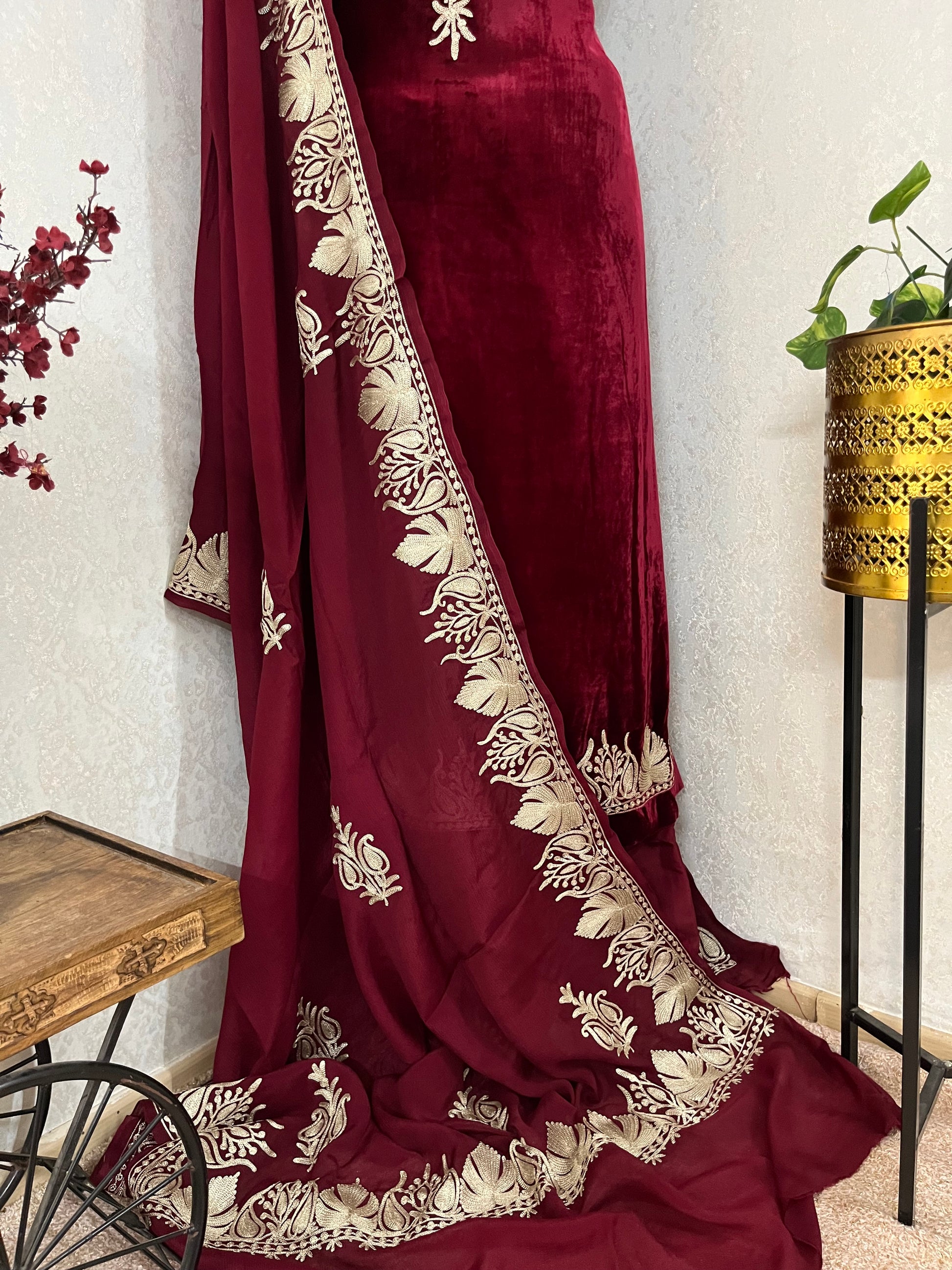 Comes with a 2.5mtr Makhmal Shirt Piece with a Pure Chinon dupatta (75*20 inches ) and 2.5 mtr Crepe bottoms