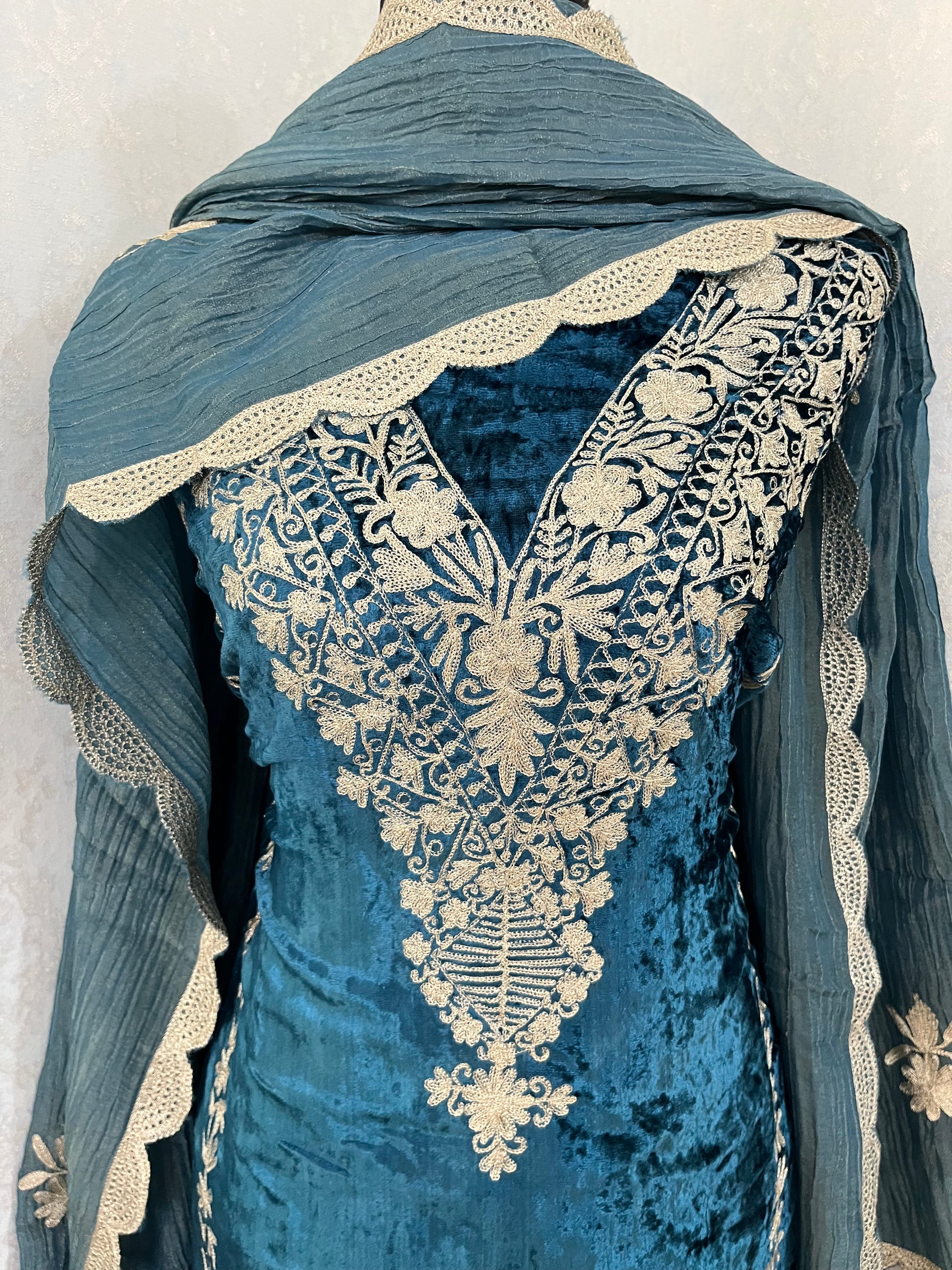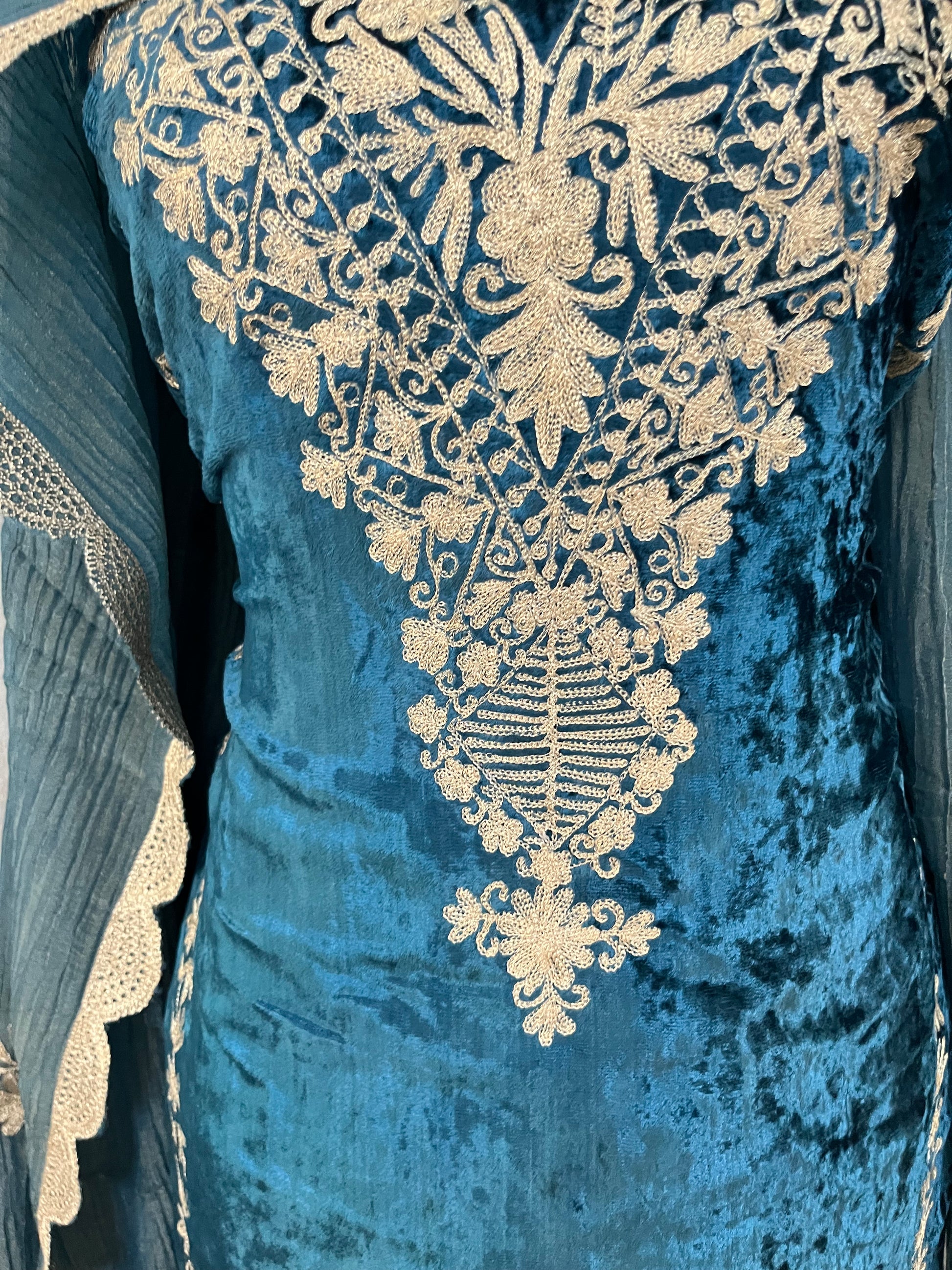 Indulge in the sheer opulence of makhmal Tilla embroidered suits, a fusion of luxury and craftsmanship. With intricate detailing, these lavish garments exude elegance, sophistication, and timeless beauty.”
