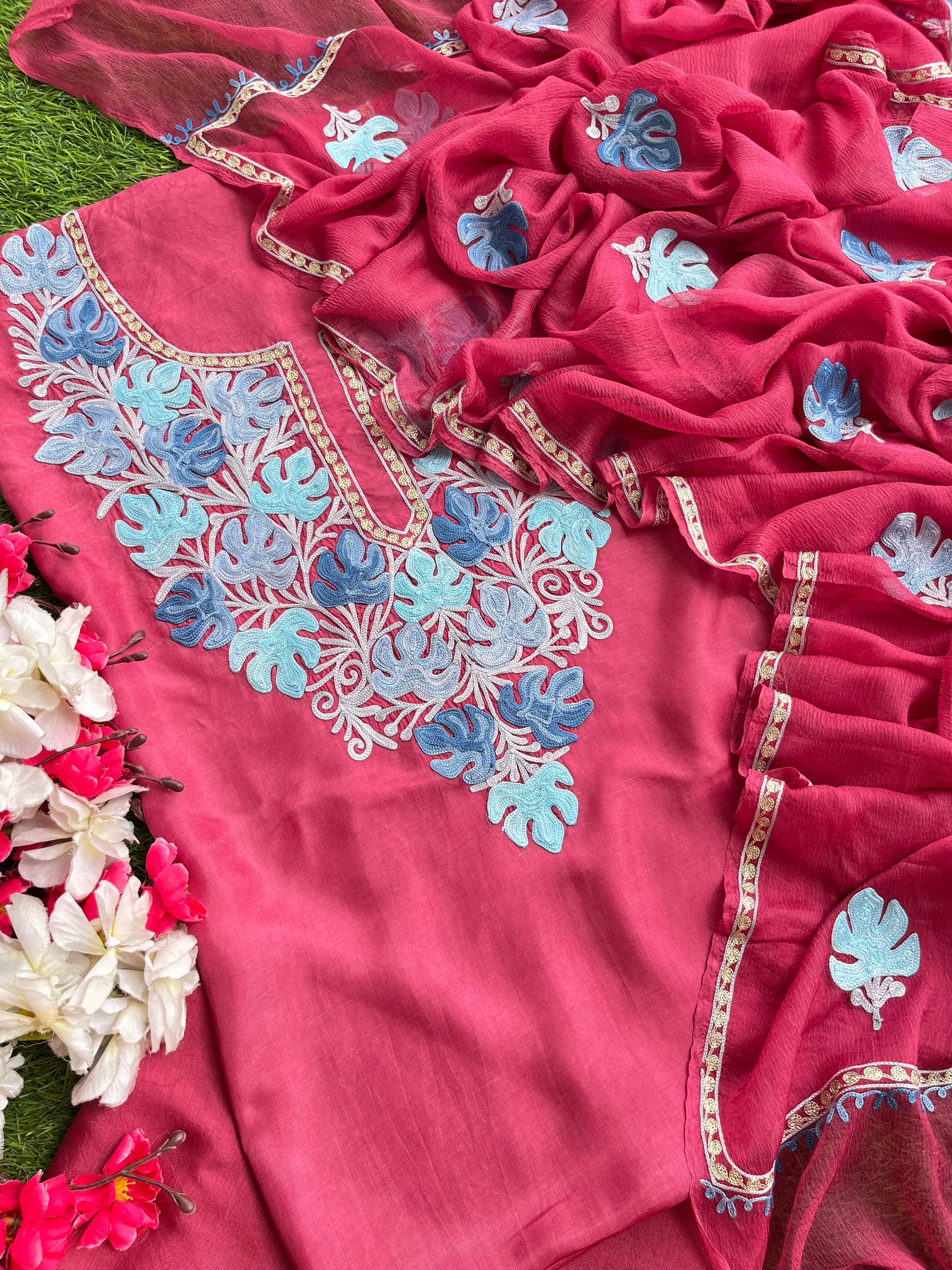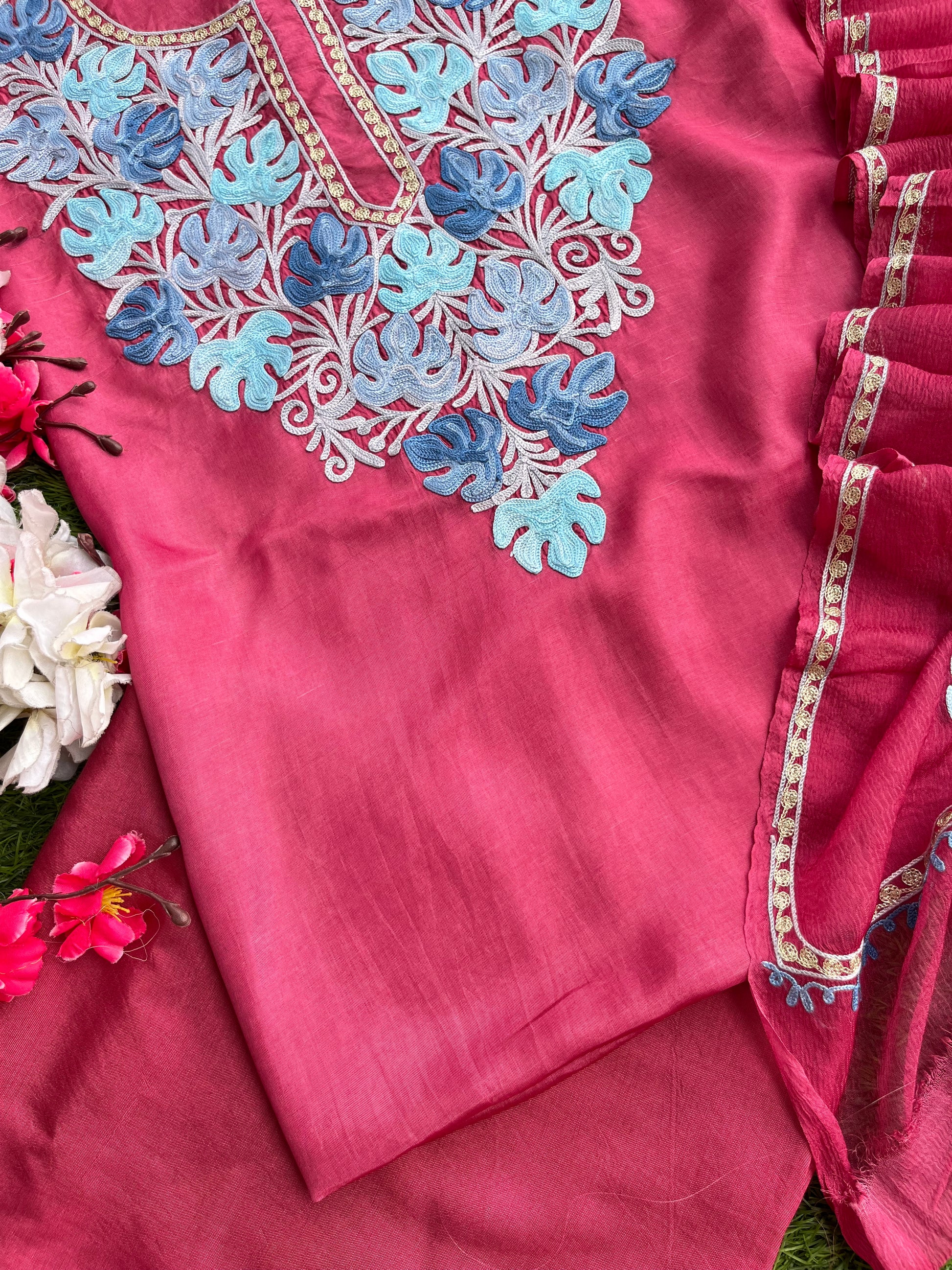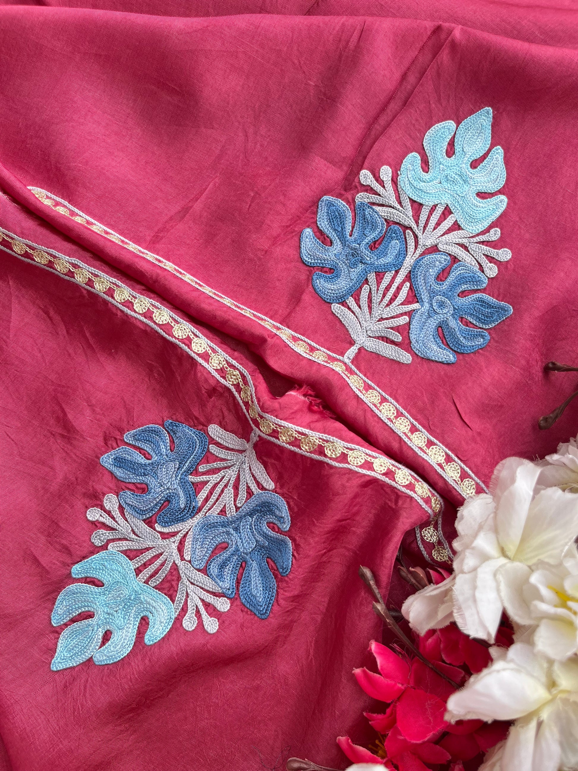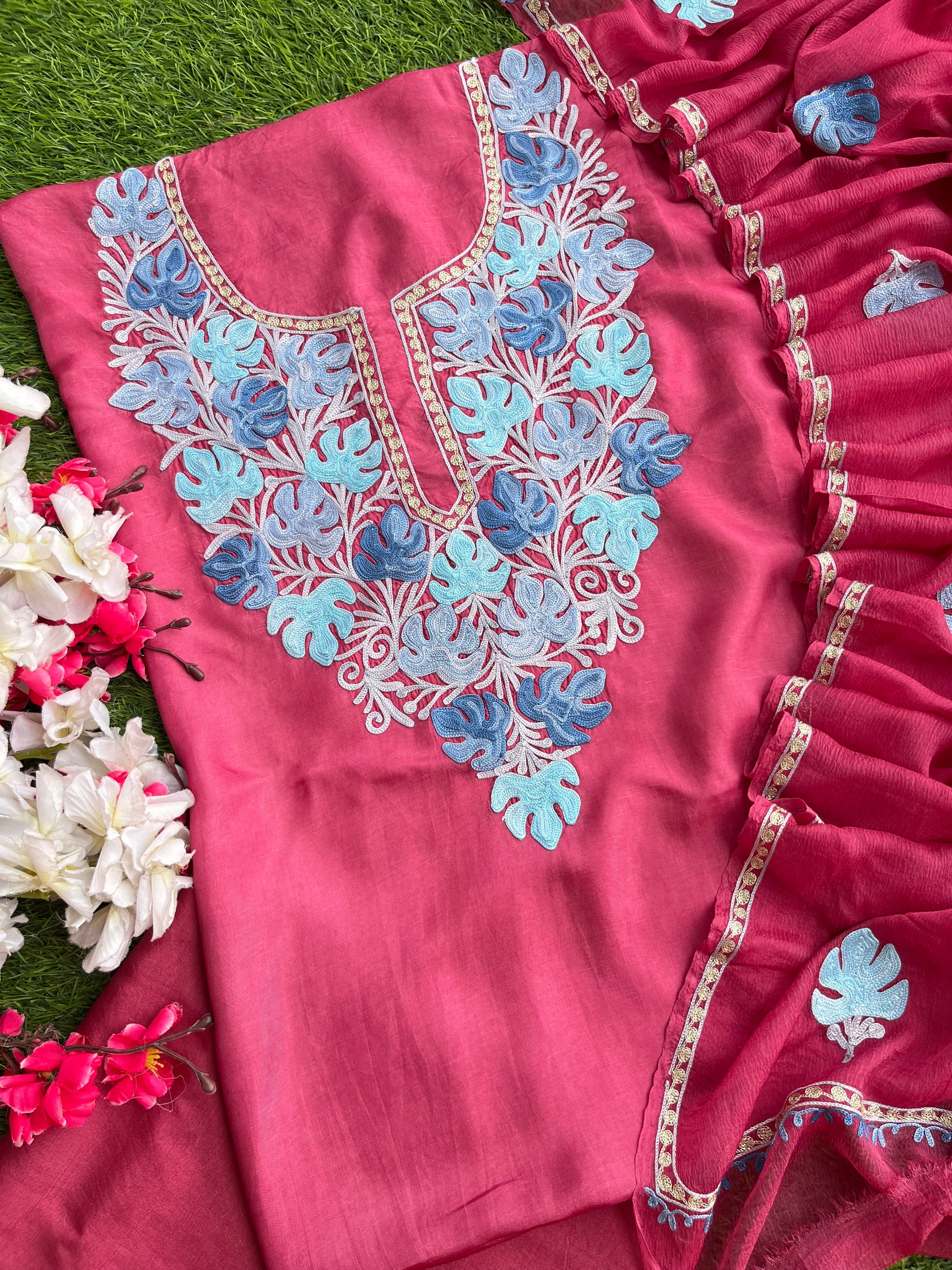 “Elegance meets tradition in this exquisite Kashmiri silk suit. Adorned with intricate embroidery, it exudes grace. Paired with a stunning heavy-embroidered dupatta, it’s a timeless ensemble of sophistication.”