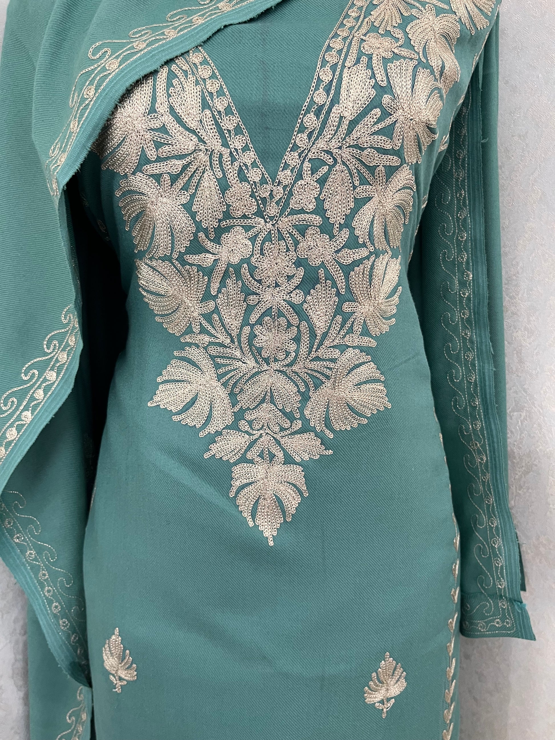 Be winter ready this season with these warm woollen three piece sets in contrasting colors and complementing embroidery !