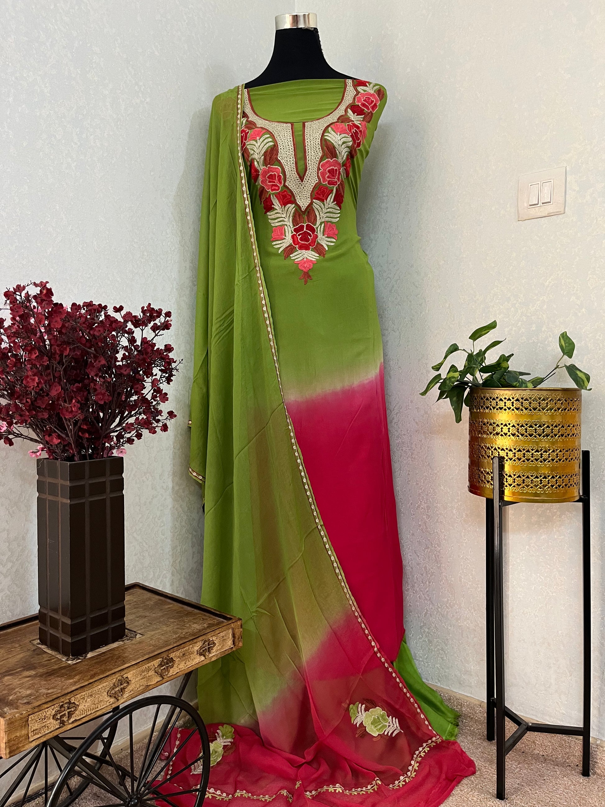 Exquisite Kashmiri craftsmanship adorns this pure georgette suit with intricate Aari embroidery.
