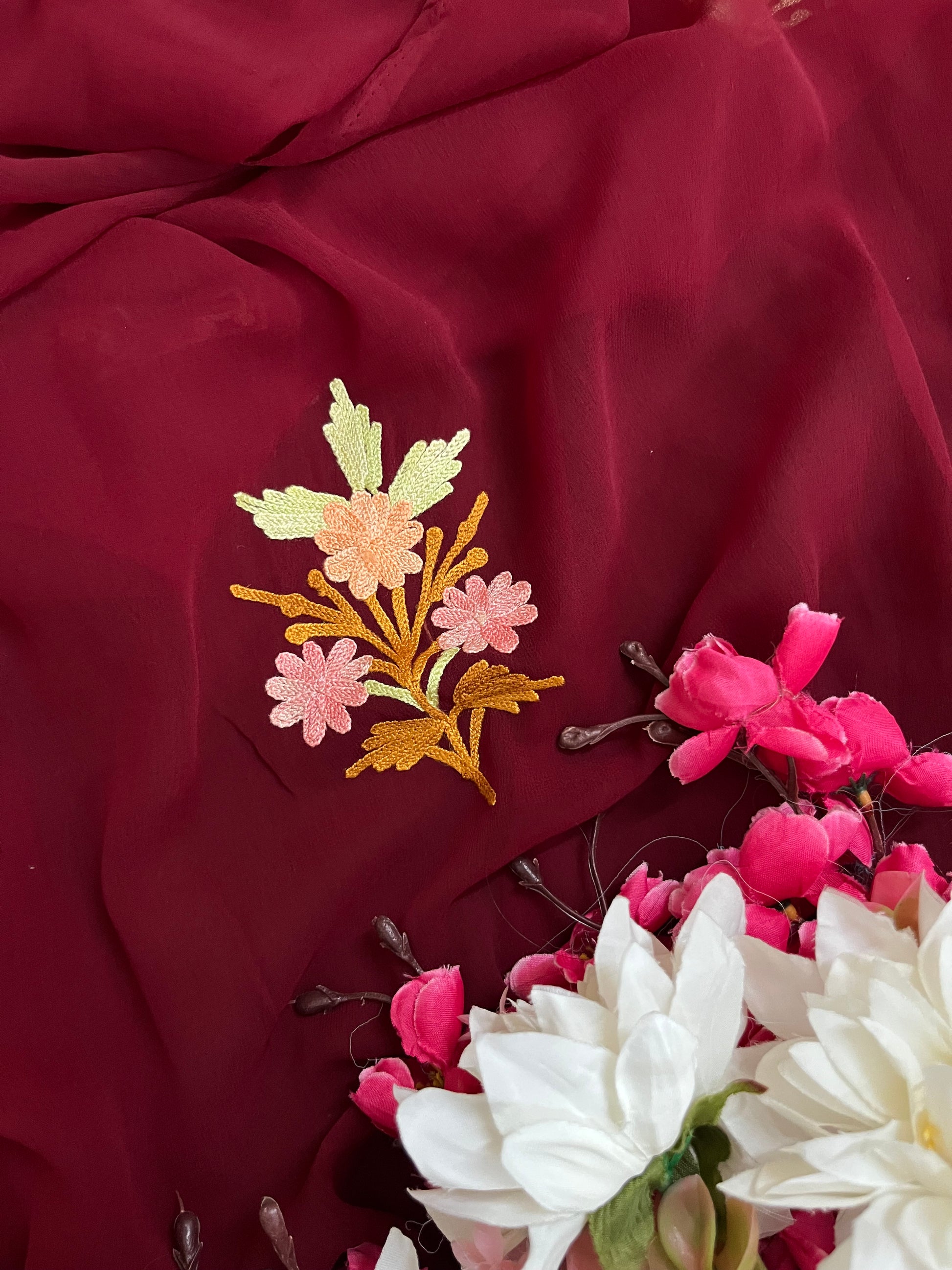 Maroon Georgette 3 Pc Aari Embroidered Suit Set