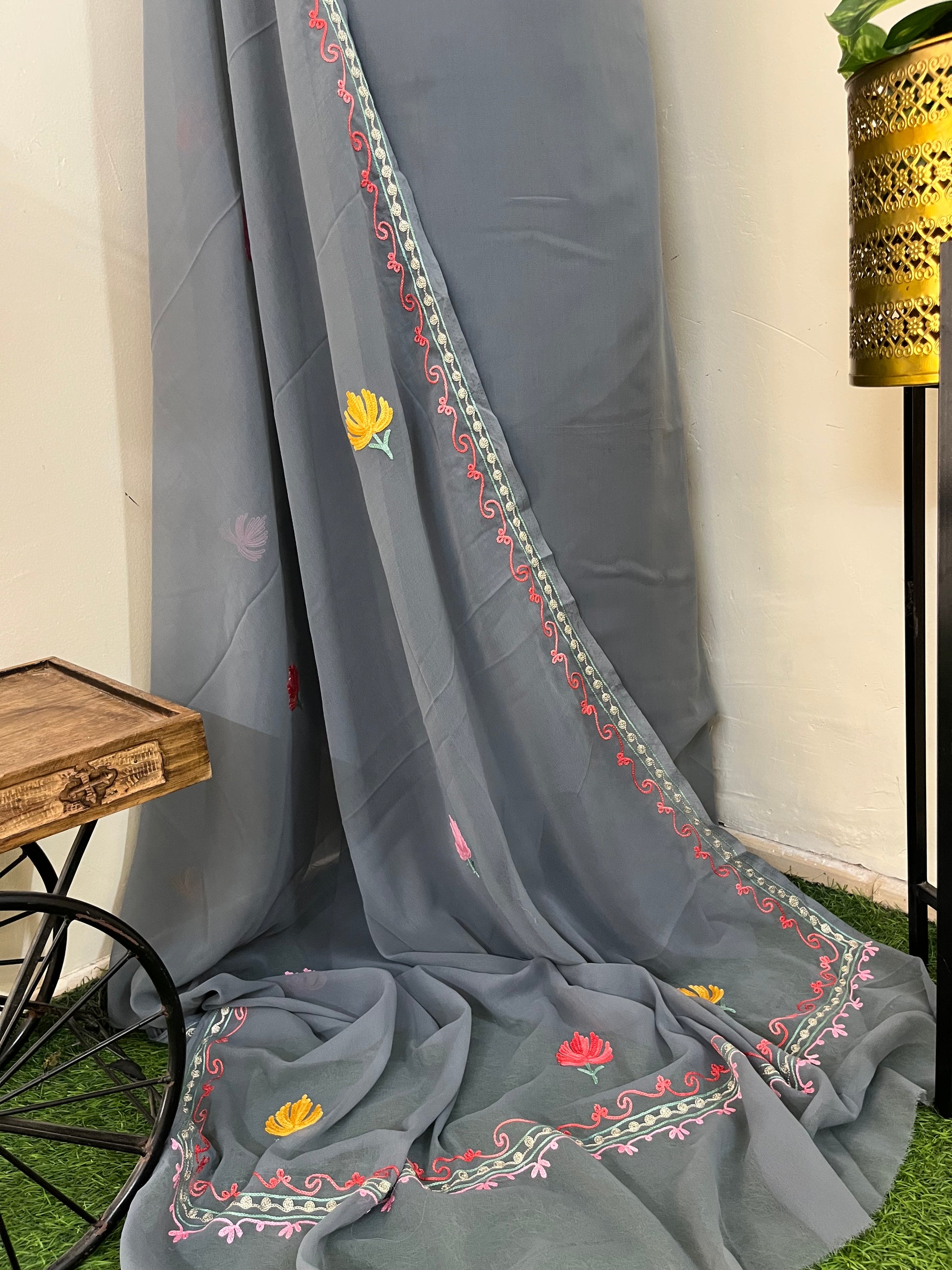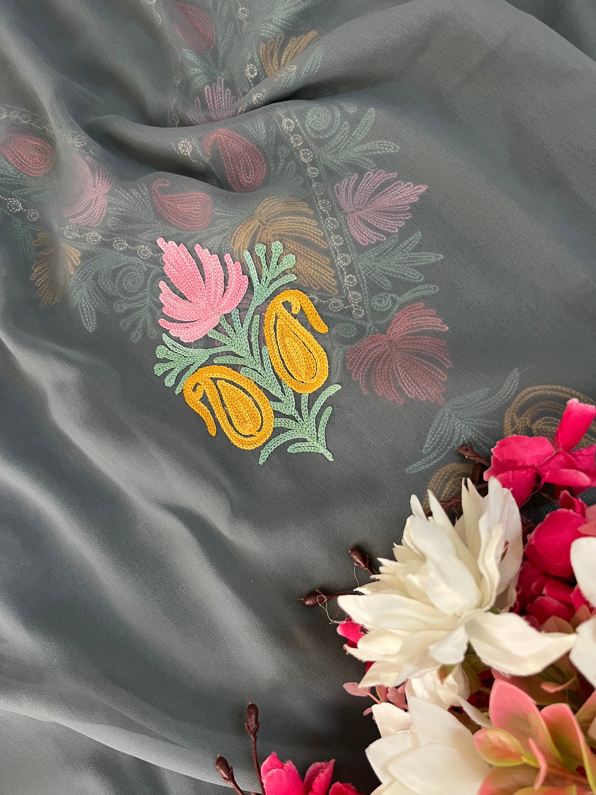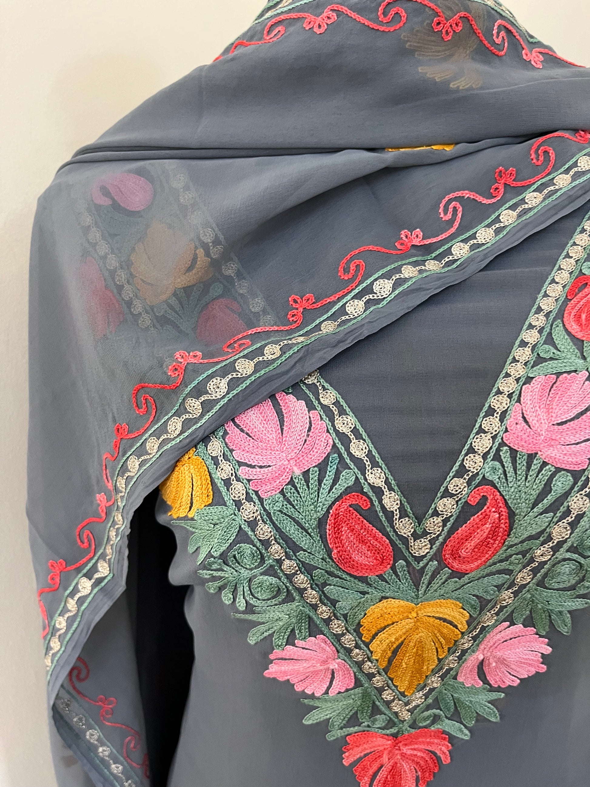 Grey Georgette 3 Pc Aari Embroidered Suit Set