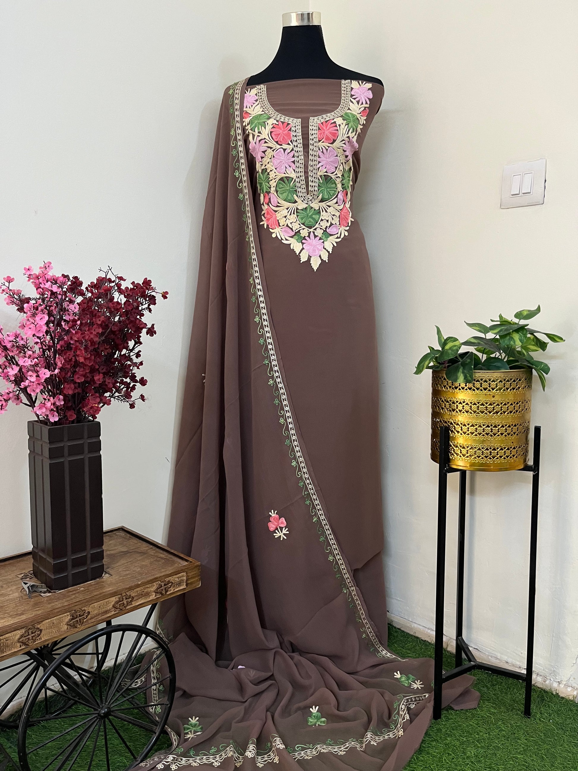 Coffee Brown Georgette 3 Pc Aari Embroidered Suit Set