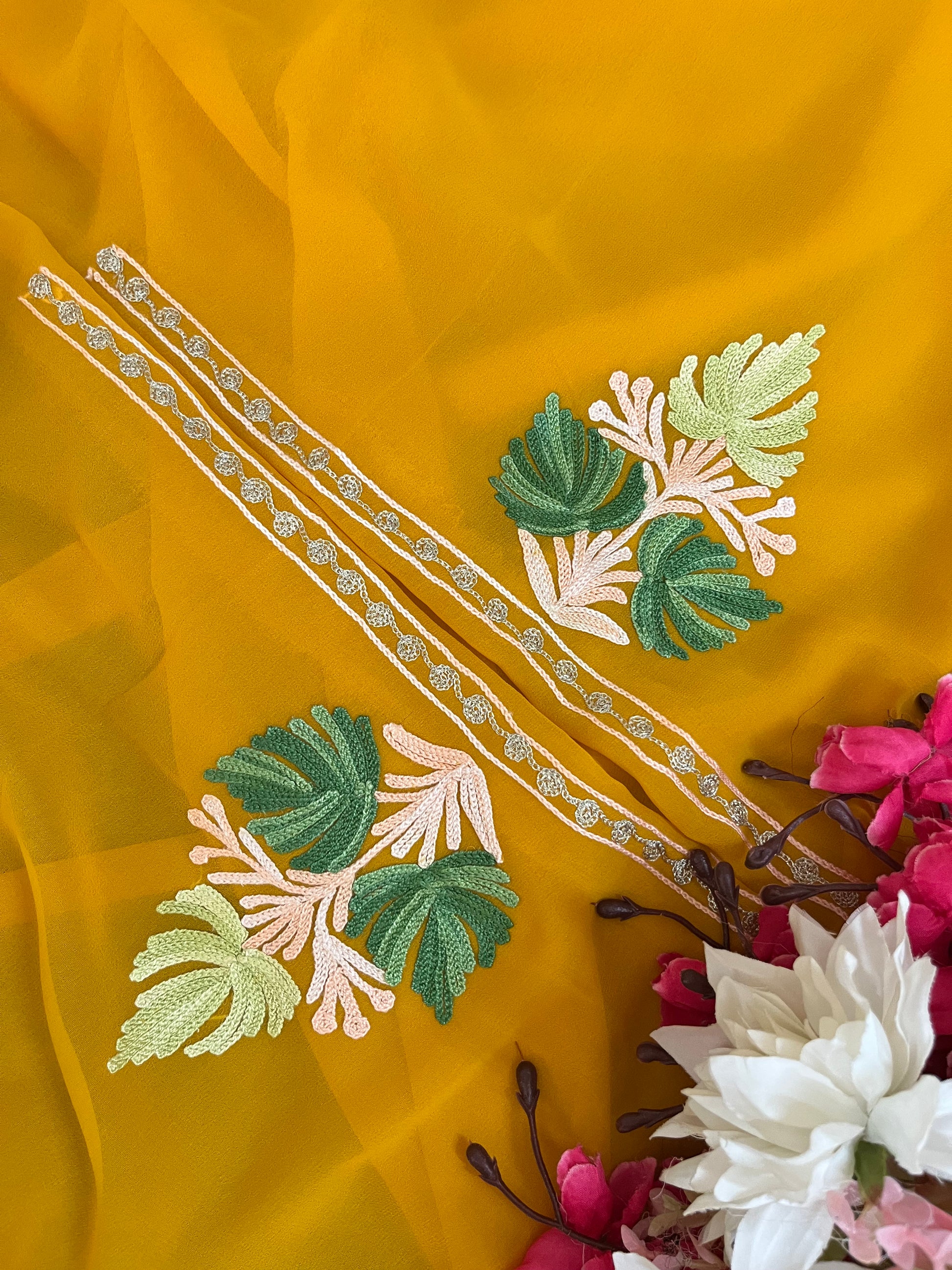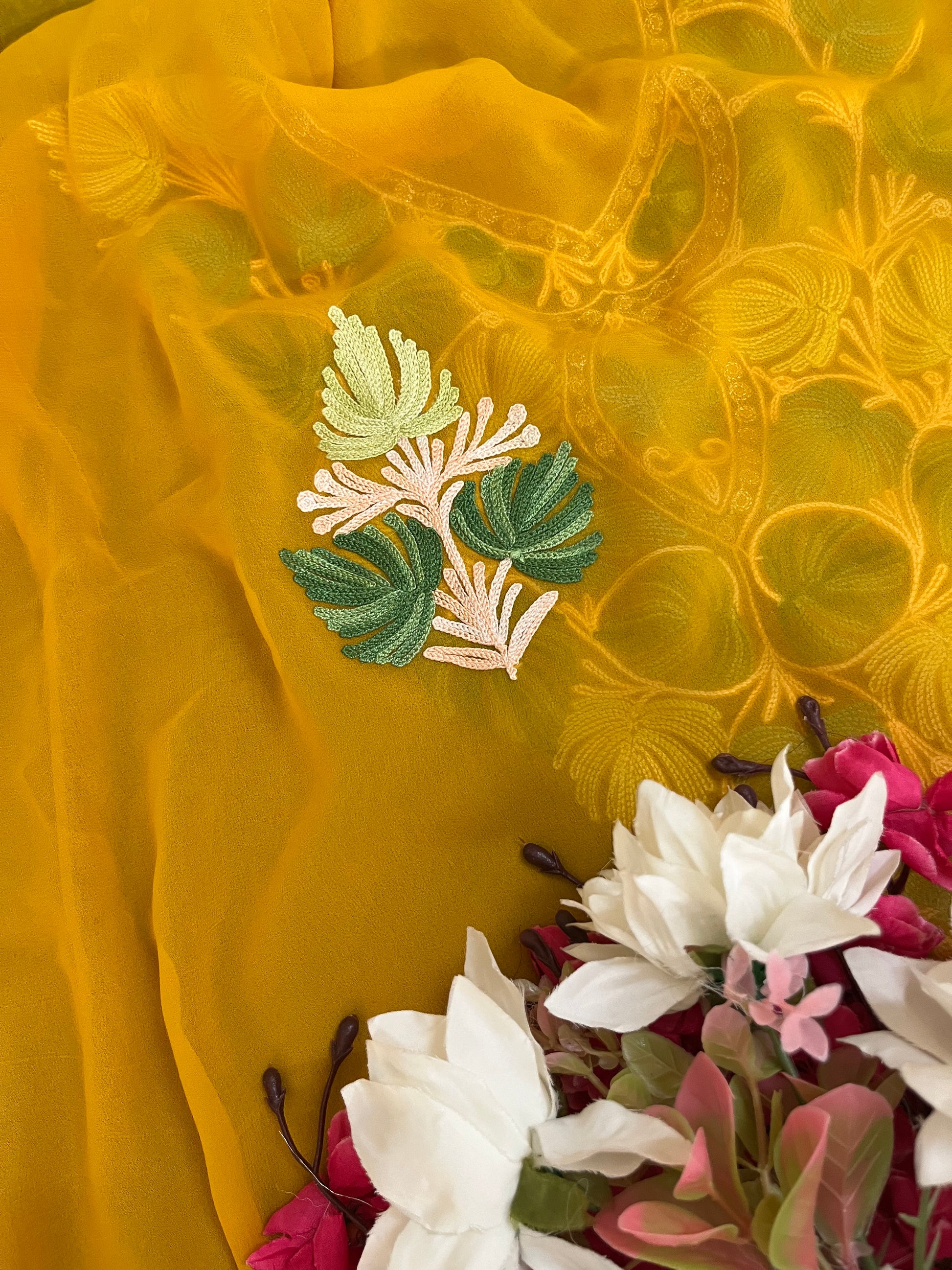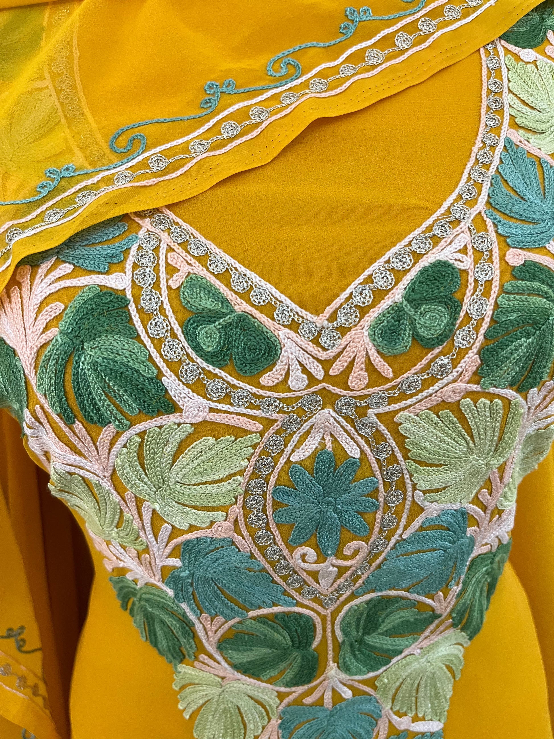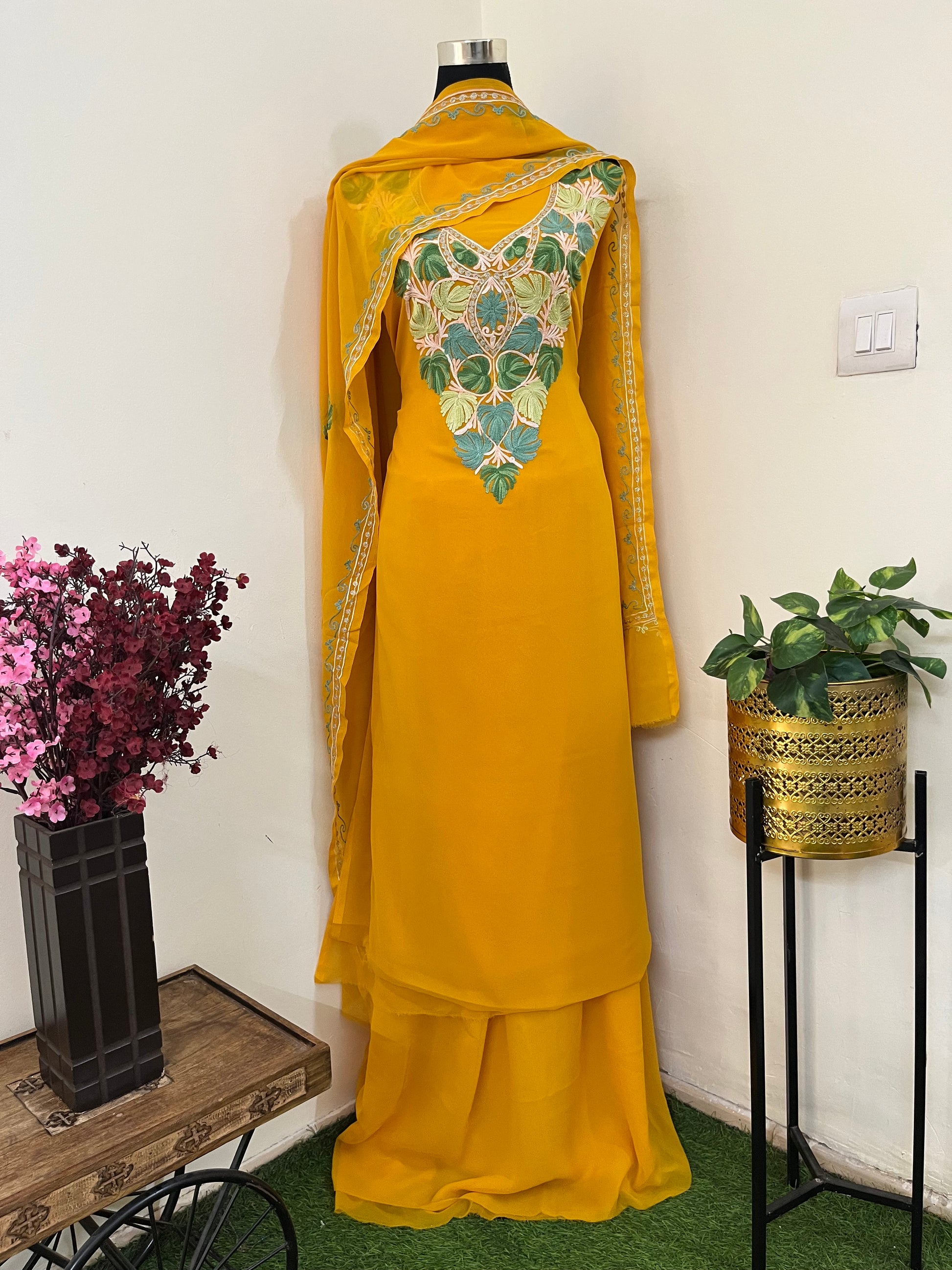 Mustard Georgette 3 Pc Aari Embroidered Suit Set