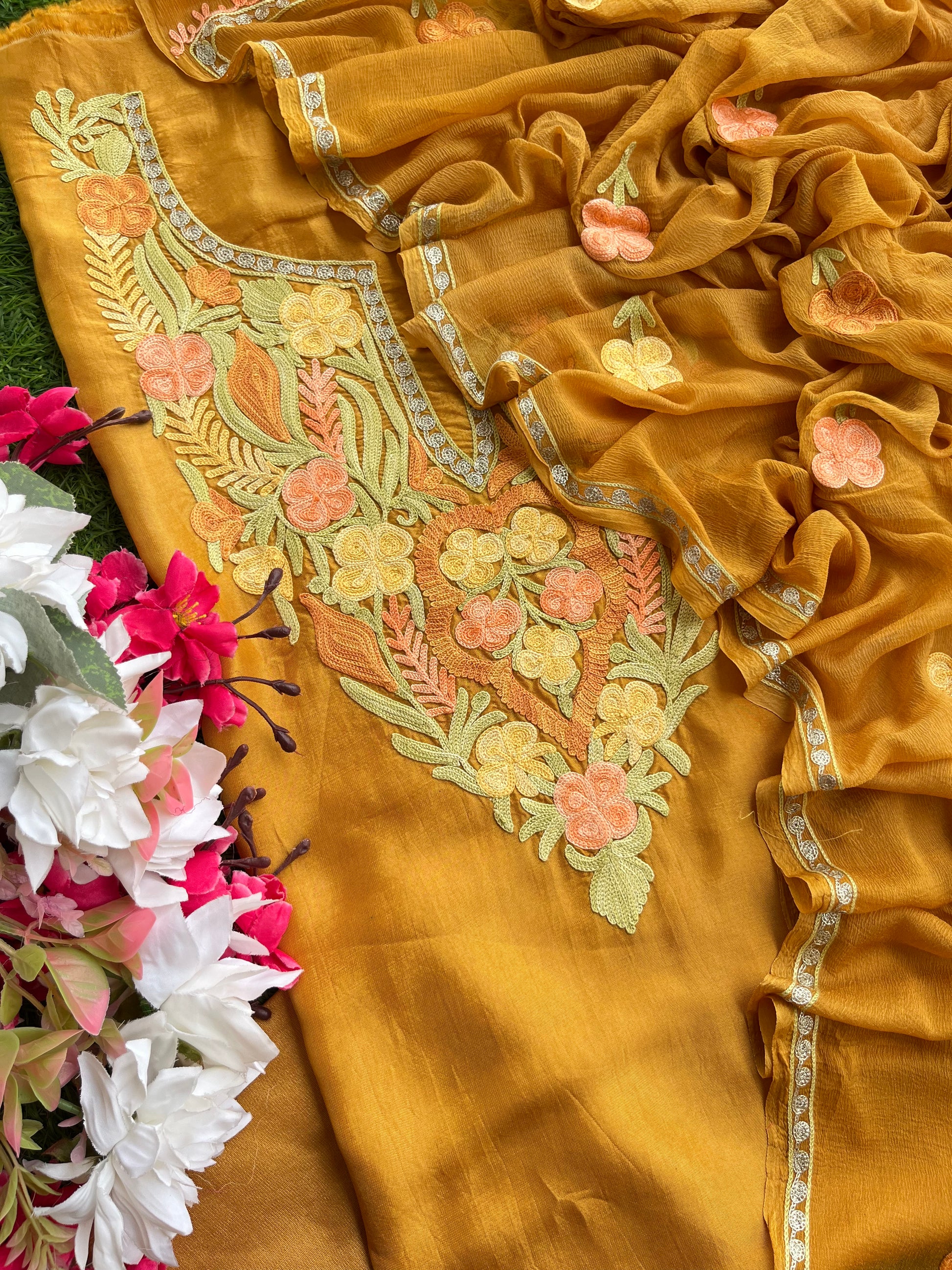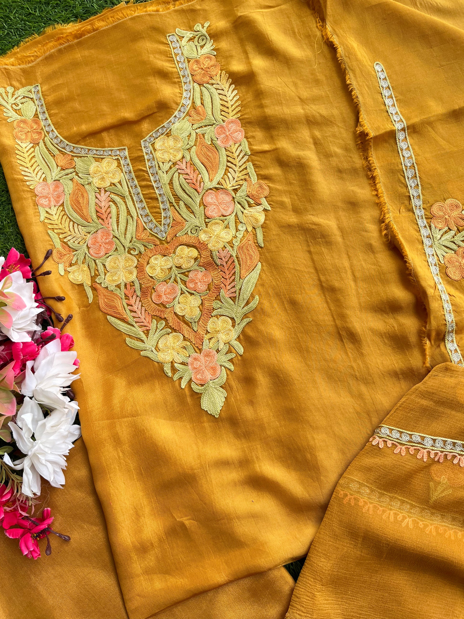 “Elegance meets tradition in this exquisite Kashmiri silk suit. Adorned with intricate embroidery, it exudes grace. Paired with a stunning heavy-embroidered dupatta, it’s a timeless ensemble of sophistication.”