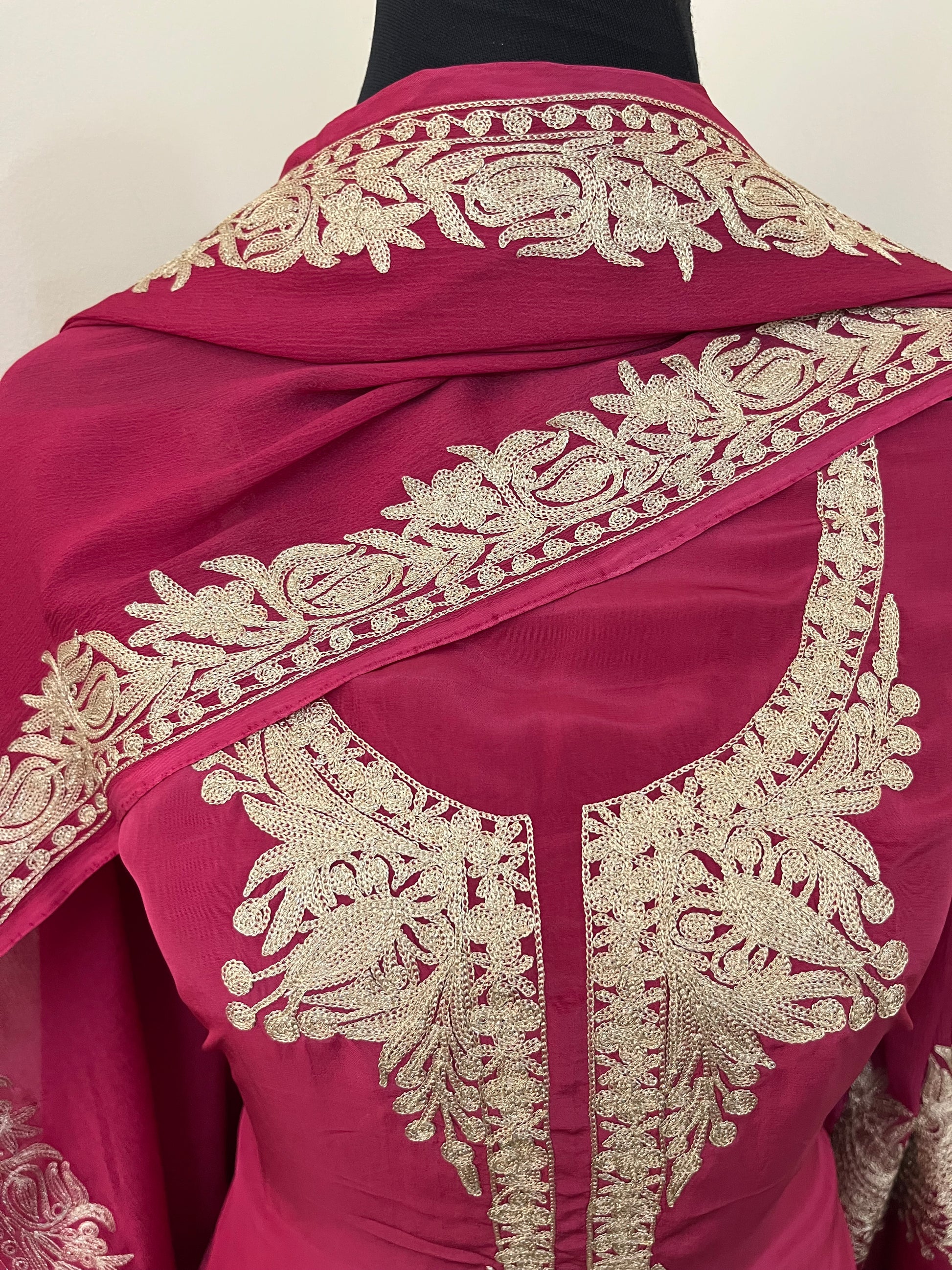 Elevate your style with this exquisite Kashmiri crape suit, adorned with intricate tilla embroidery. Paired with a heavily embellished dupatta, this elegant ensemble beautifully blends traditional craftsmanship with timeless sophistication, perfect for festive and special occasions.