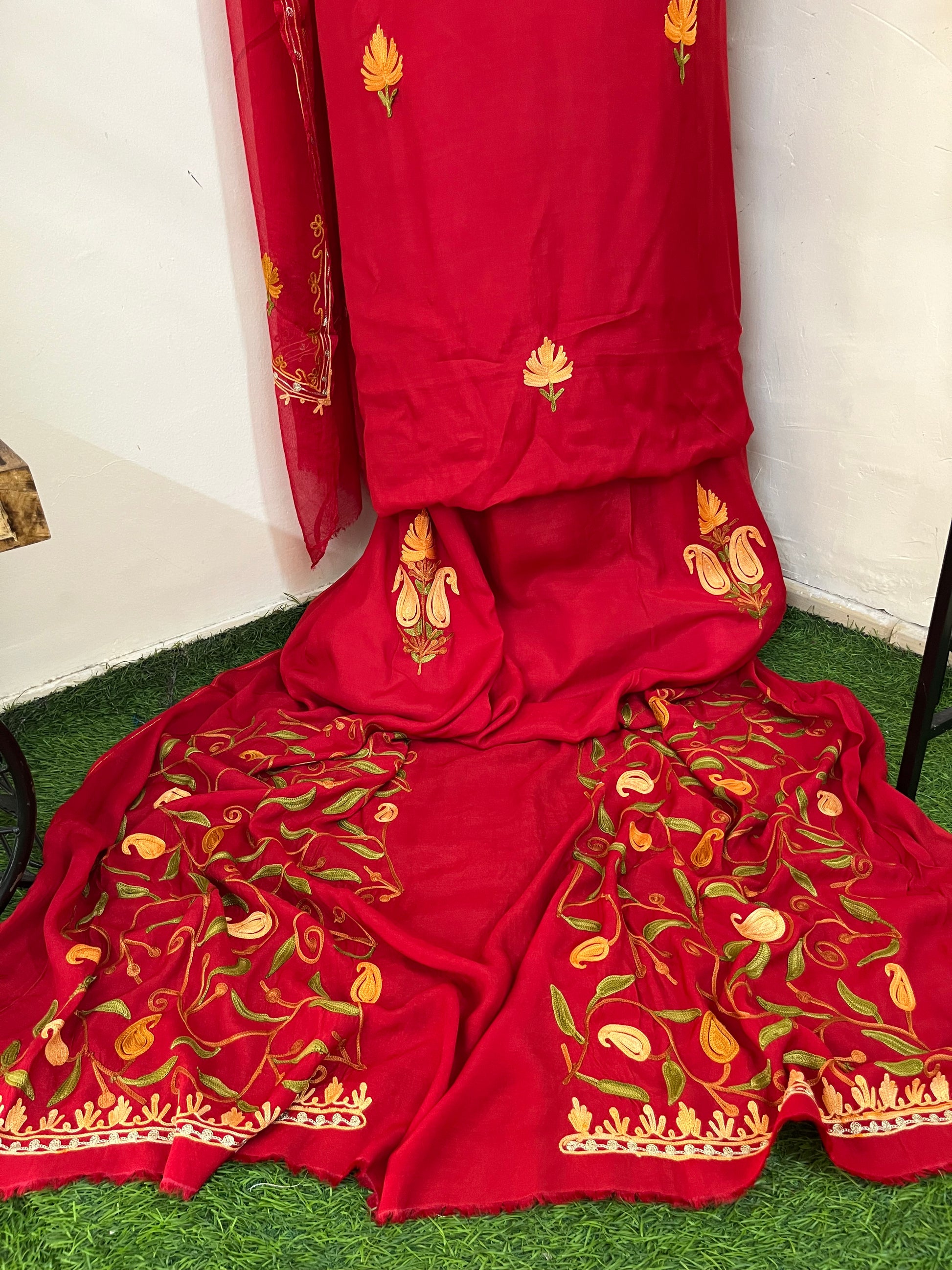 Red Muslin Cotton Jaal Sleeves Kashmiri 3pc Suit