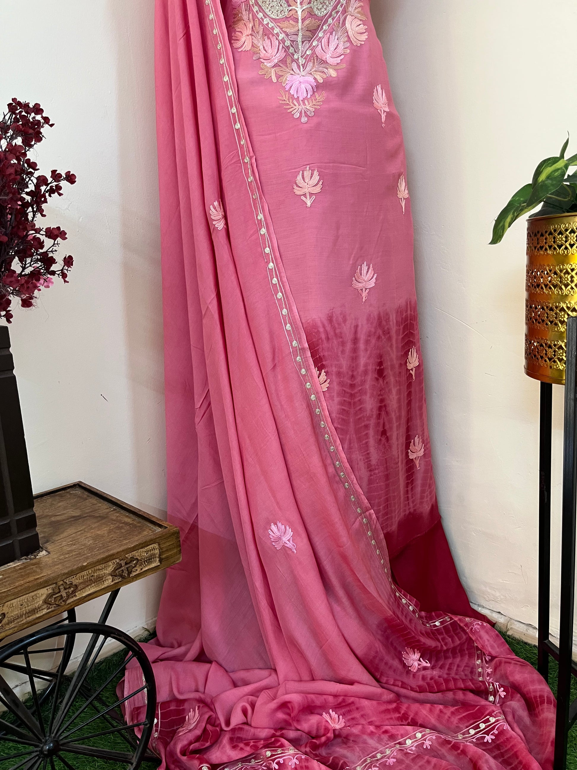 Elegant Kashmiri Aari embroidered suit crafted in pure mul cotton, featuring intricate Aari Work and stunning Shibori dye technique. This unique blend of traditional artistry and contemporary style offers comfort, grace, and timeless charm—perfect for festive or casual occasions.