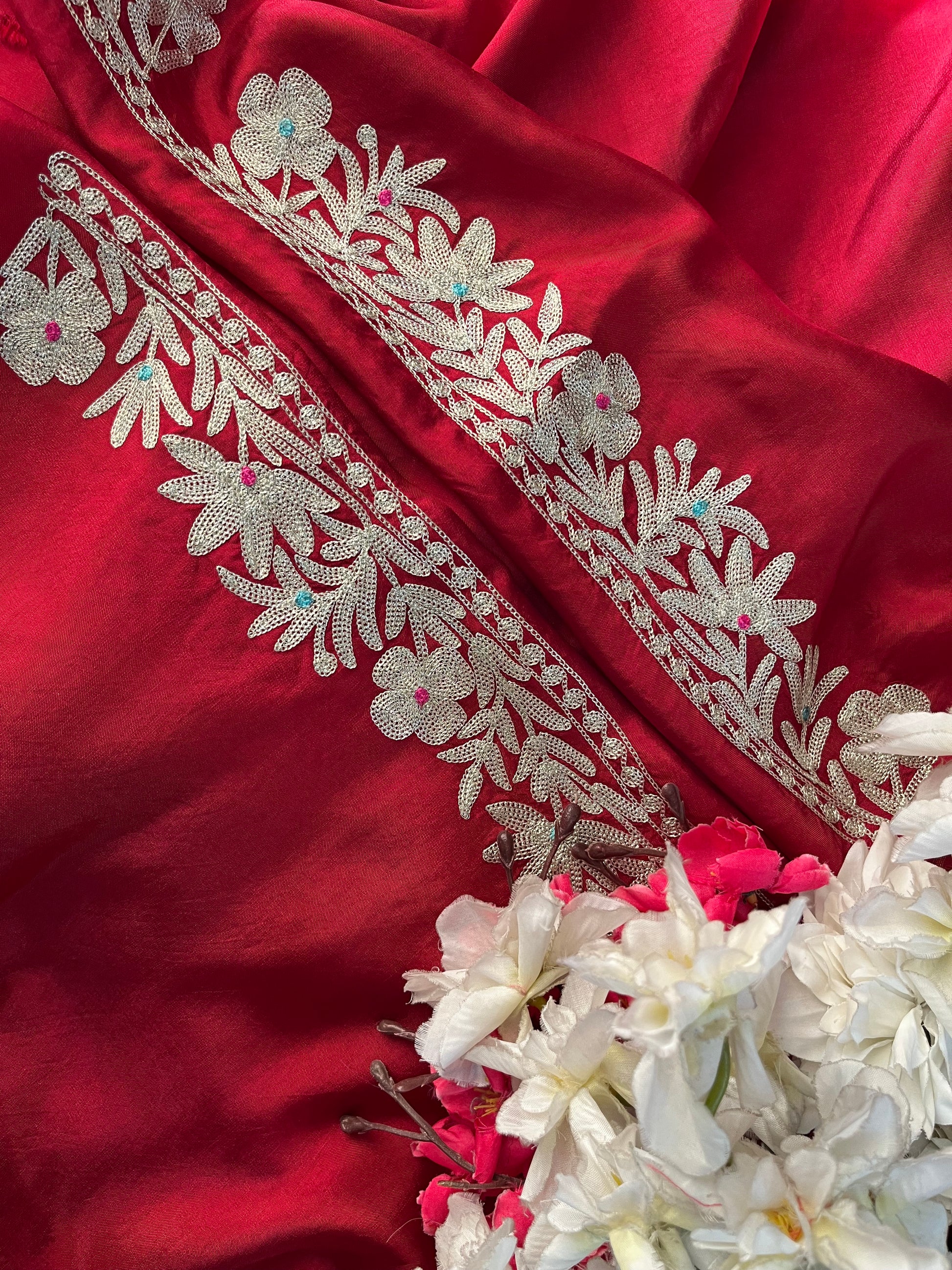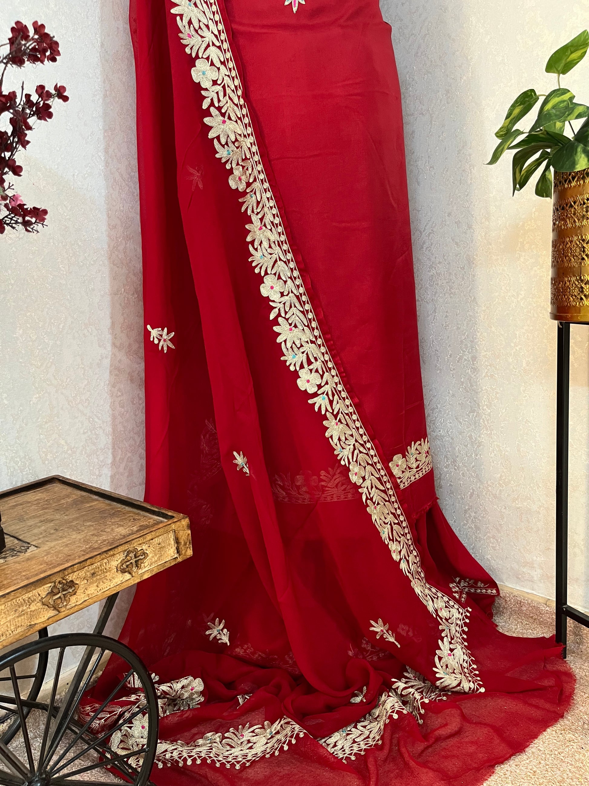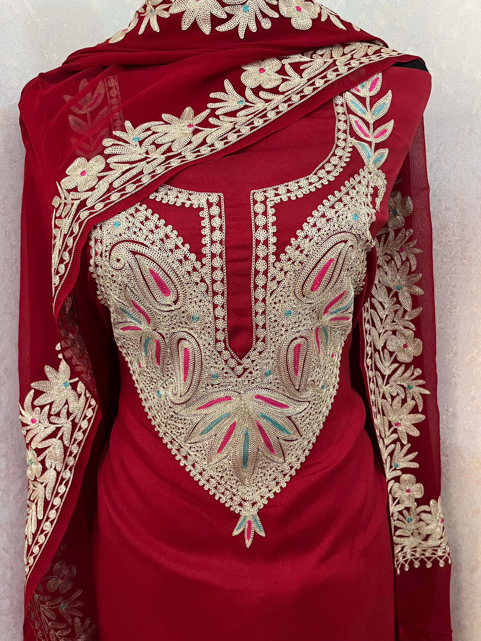 Elevate your style with this pure and traditional Kashmiri suit featuring intricate Aari and Tilla fusion embroidery. Crafted in premium opada silk fabric, it comes with a pure chiffon dupatta and matching cotton silk bottom. The dupatta boasts a beautifully detailed border, adding grace and richness to the overall ensemble.