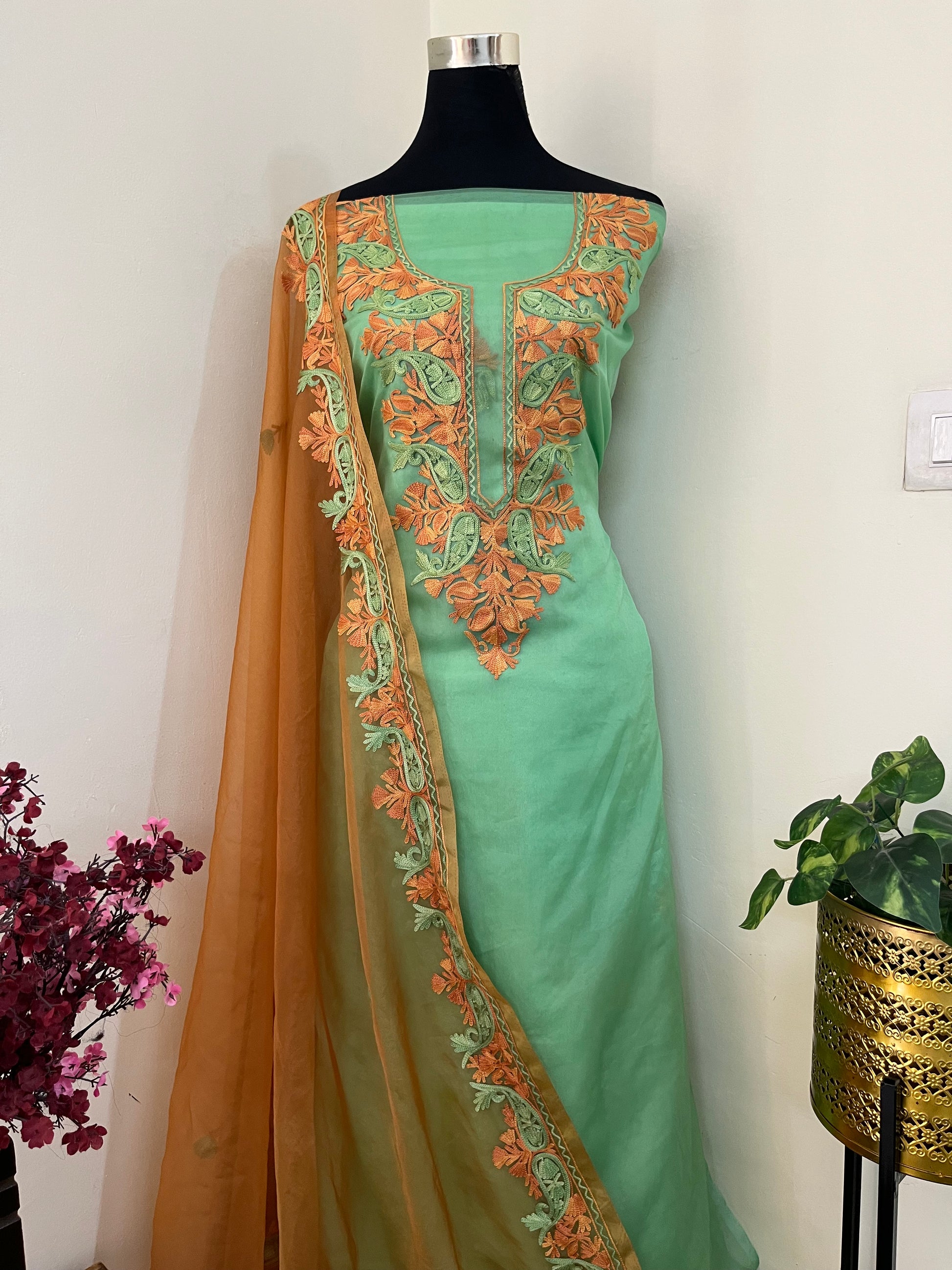Soft Green Soft Tissue Kashmiri Suit