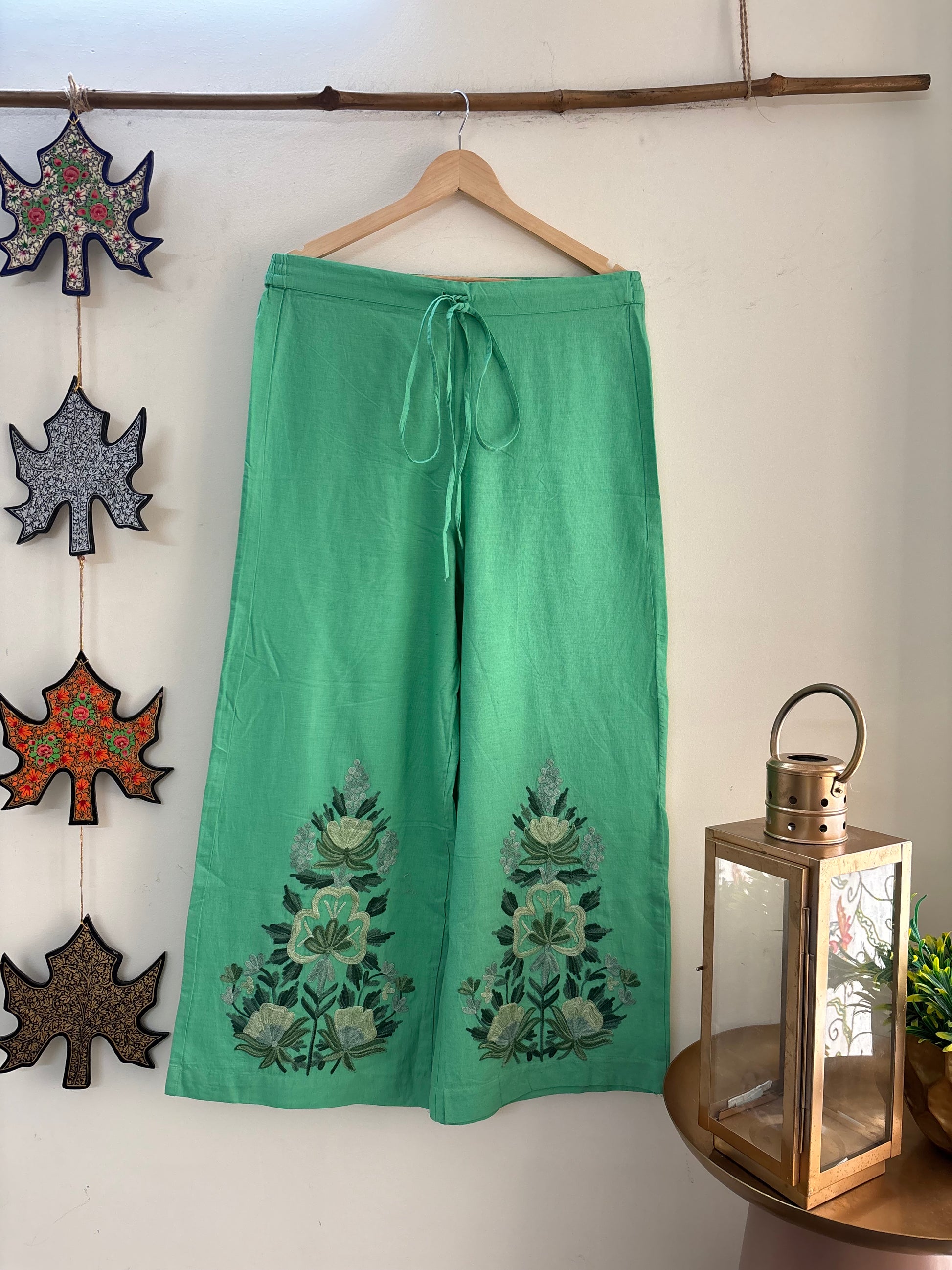 Women Green Solid Cropped Wide Leg Aari Embroidered Palazzos ‘XL’